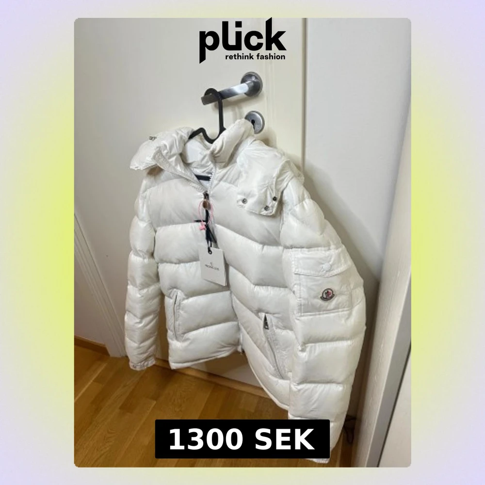 Säljer en snygg vit pufferjacka från Moncler med glansig finish och klassisk logga på ärmen. Jackan har huva, två dragkedjeförsedda fickor och justerbara detaljer vid ärmslut. Perfekt för kalla dagar och riktigt stilren look.