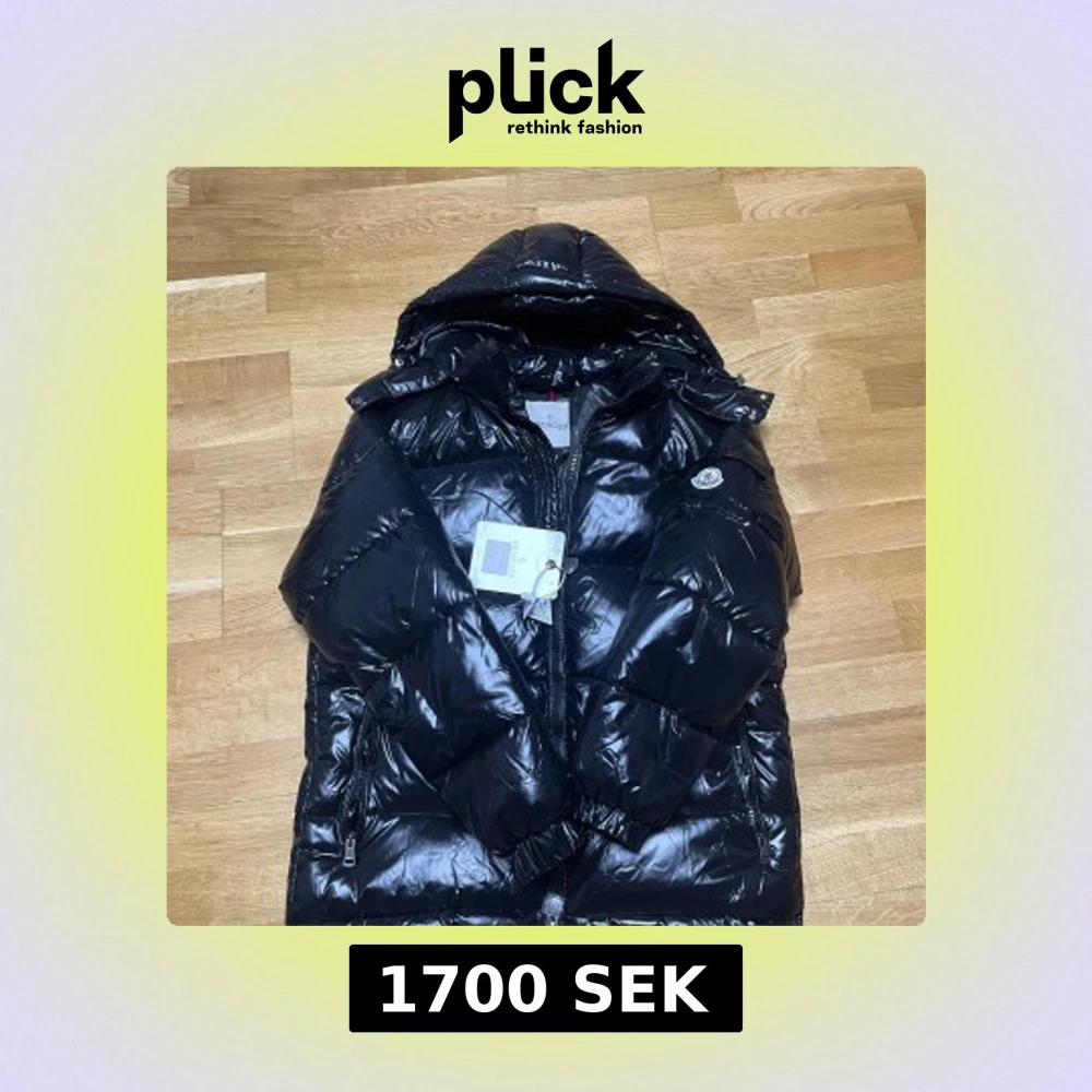 Säljer en svart, glansig pufferjacka från Moncler med huva och dragkedja. Jackan har klassisk Moncler-logga på bröstet och innerfoder med serietidningsmönster. Perfekt för kalla dagar och riktigt snygg streetstil.