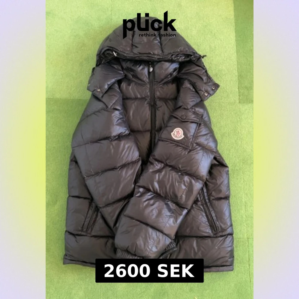 Äkta Svart pufferjacka från Moncler med huva, dragkedja och logotyp på ärmen. Jackan har quiltad design, sidofickor med dragkedja och elastiska muddar. Perfekt för kalla dagar. Snygg och klassisk look med Moncler-detaljer. Finns däremot lite skador på den som ni ser i bilderna men inget som syns utan att lägga märke till det. Storlek 4 men sitter mer som S/M. Finns i Stockholm kan även fraktas.