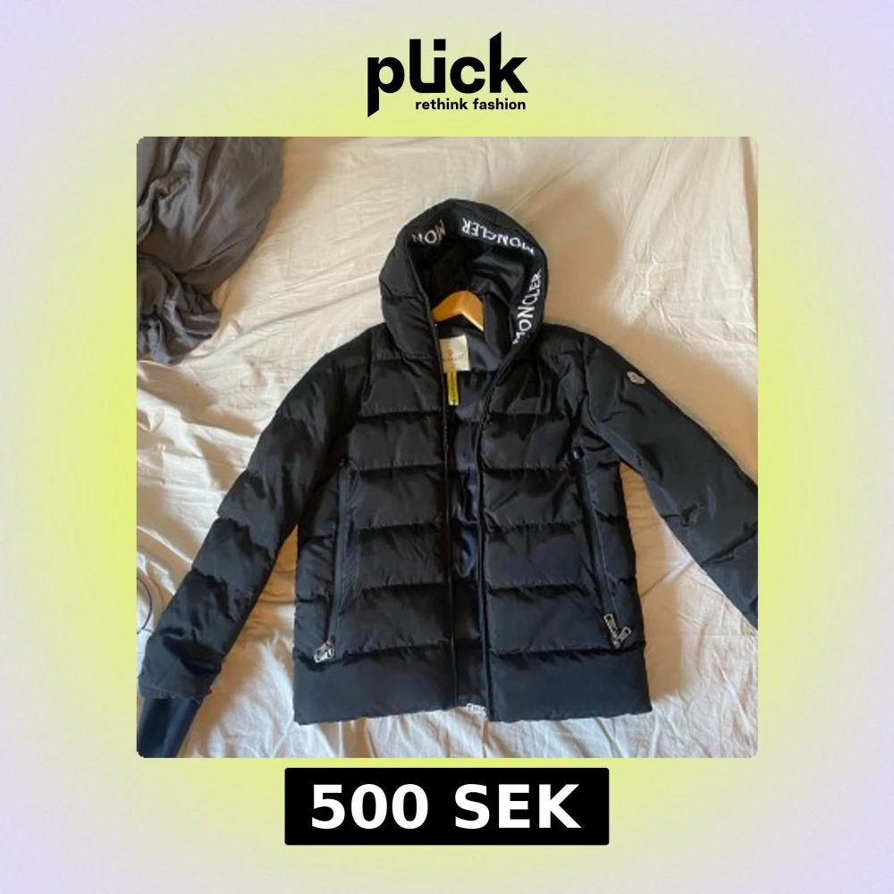 Säljer en svart dunjacka från Moncler med fet logga på ärmen och tryckt Moncler-text på insidan av huvan. Jackan har dragkedjor på fickorna och är quiltad för extra värme. Perfekt för kalla dagar och har en clean, modern look.