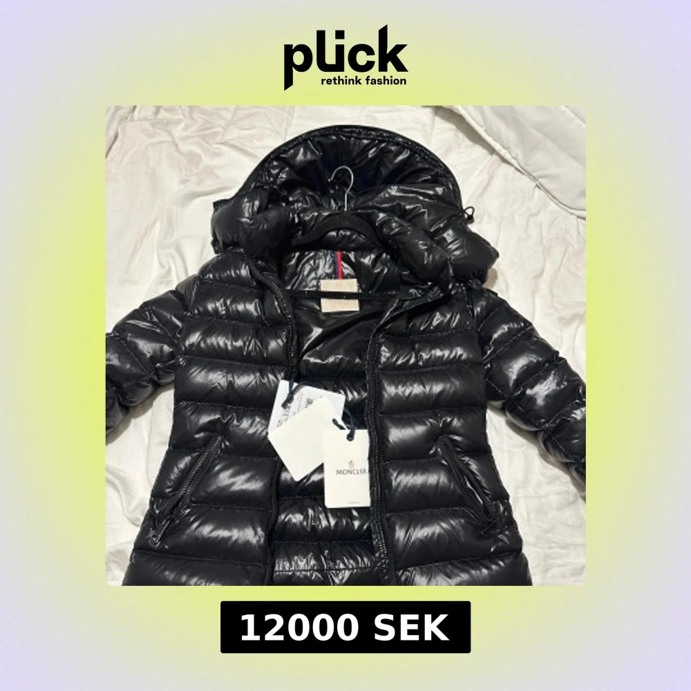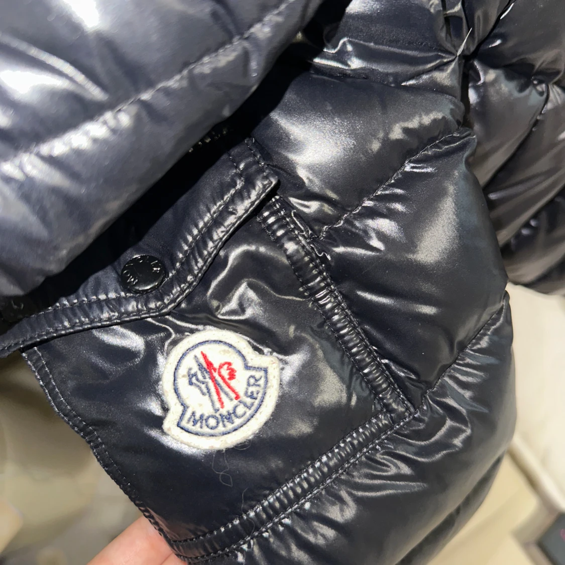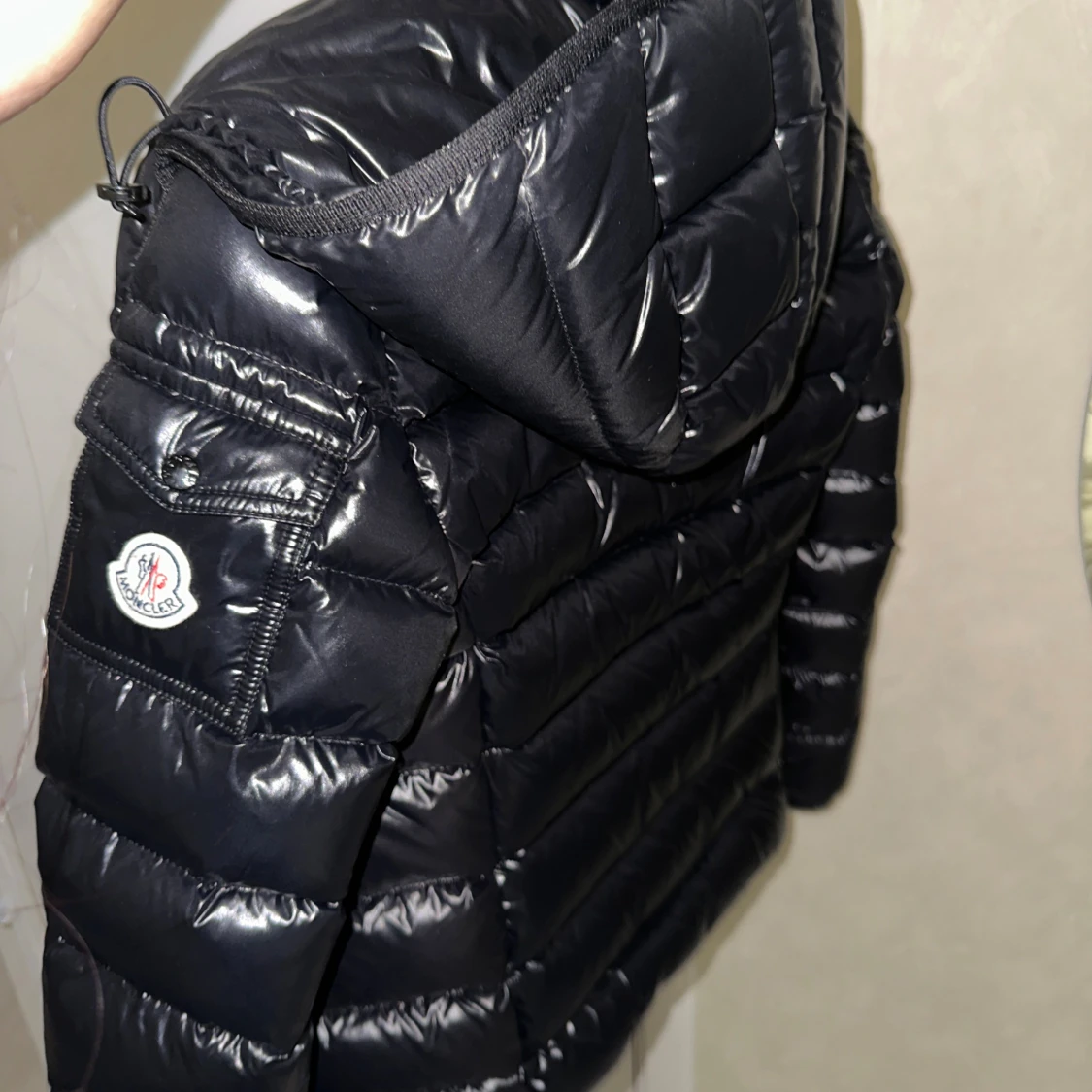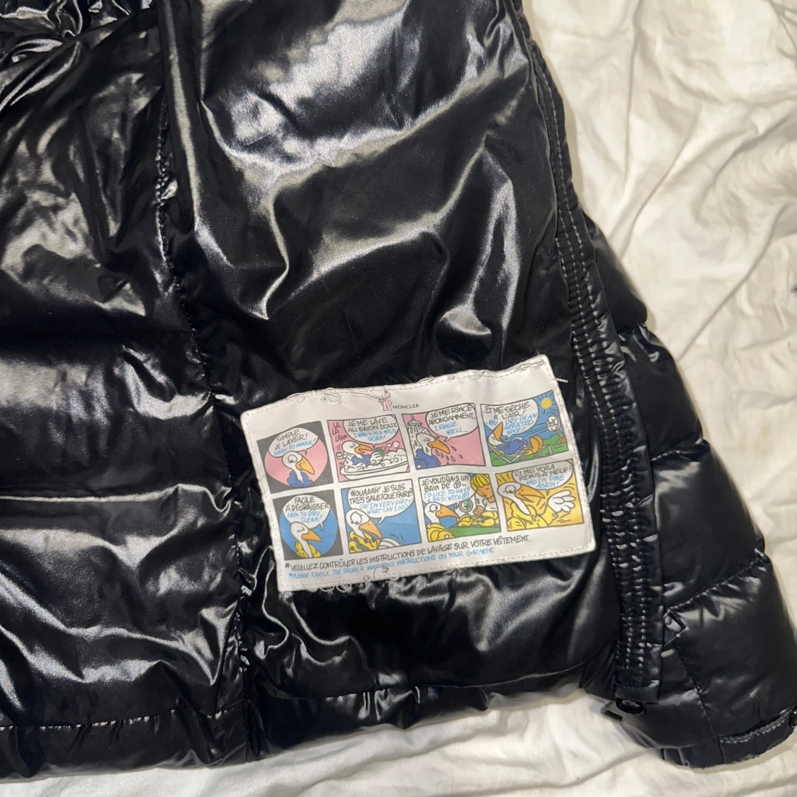 Säljer en svart, glansig pufferjacka från Moncler med huva och dragkedja. Jackan har Moncler-logga på ärmen, två fickor med dragkedja och coolt serietidningsfoder på insidan. Fylld med dun för extra värme och perfekt för kalla dagar.