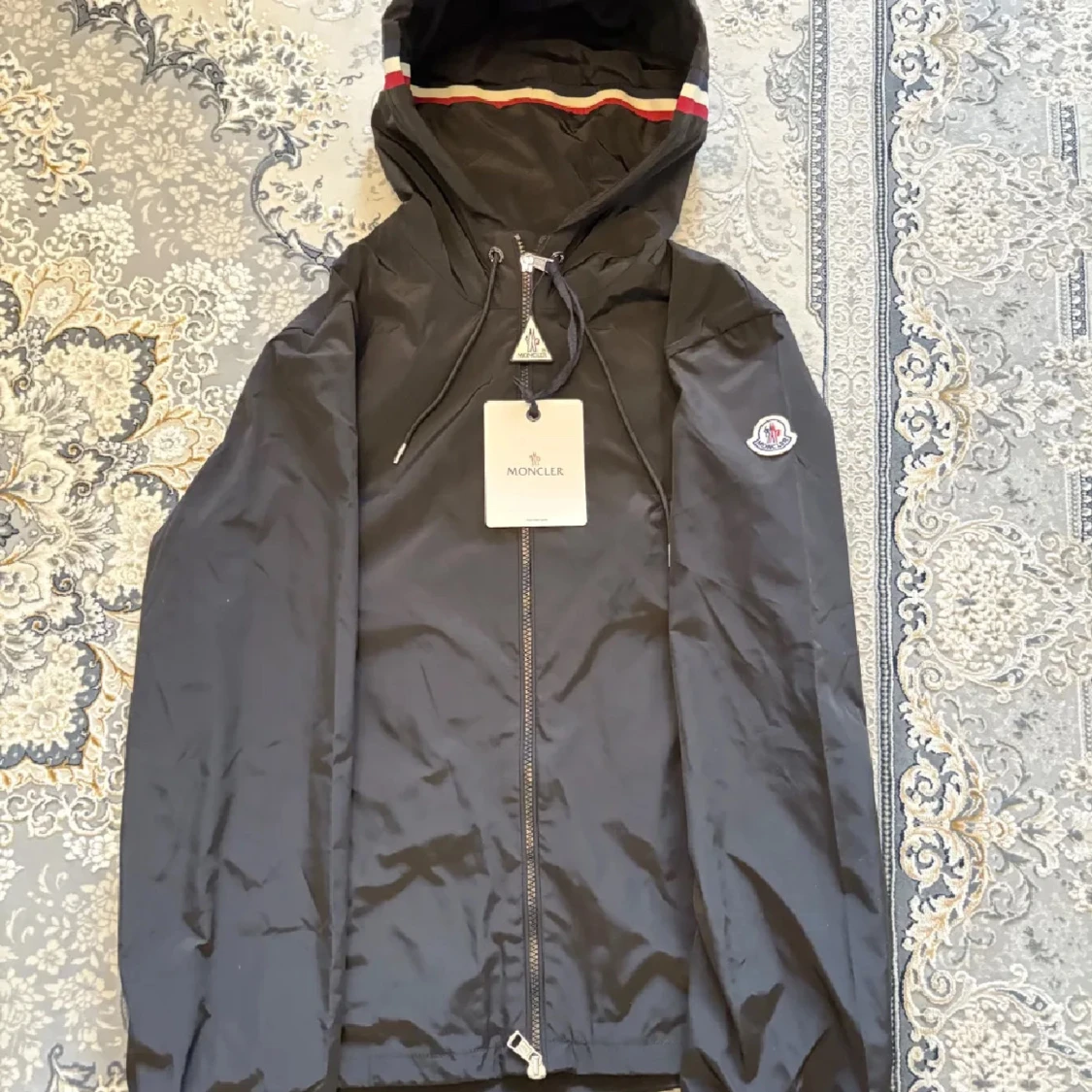 Marinblå vindjacka från Moncler med huva och dragkedja framtill. Jackan har Moncler-logga på ärmen och snygga detaljer med snörning i huvan. Materialet är lätt och känns sportigt, perfekt för blåsiga dagar. Klassisk och stilren design med diskreta färgdetaljer i huvan.