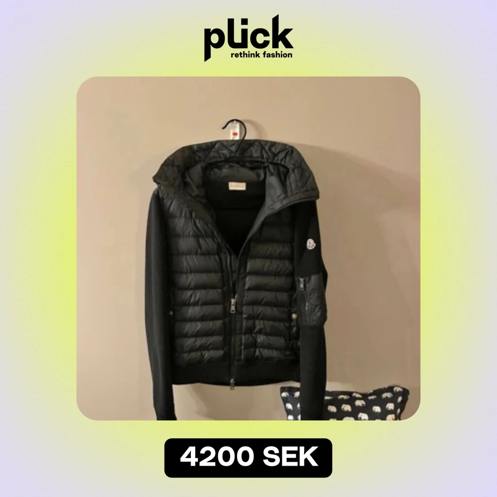 Svart moncler cardigan med luva. Den är liten i storlek så den passar bra som M men den är storlek L. Cond - 7/10! Inga håll eller sådant, lite små slitage möjligtvis