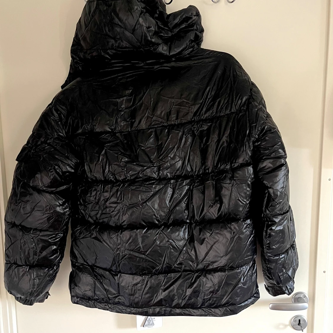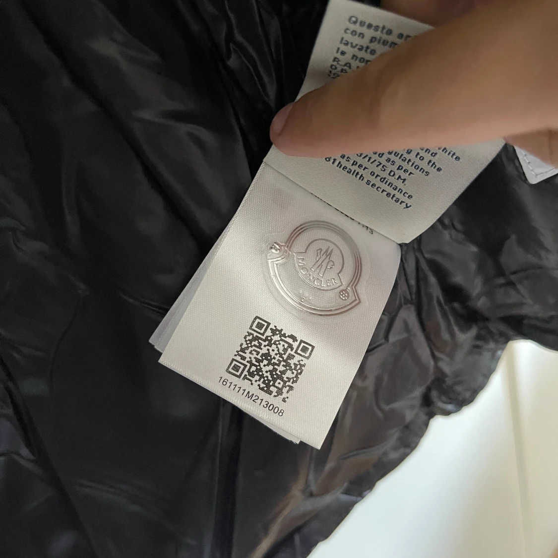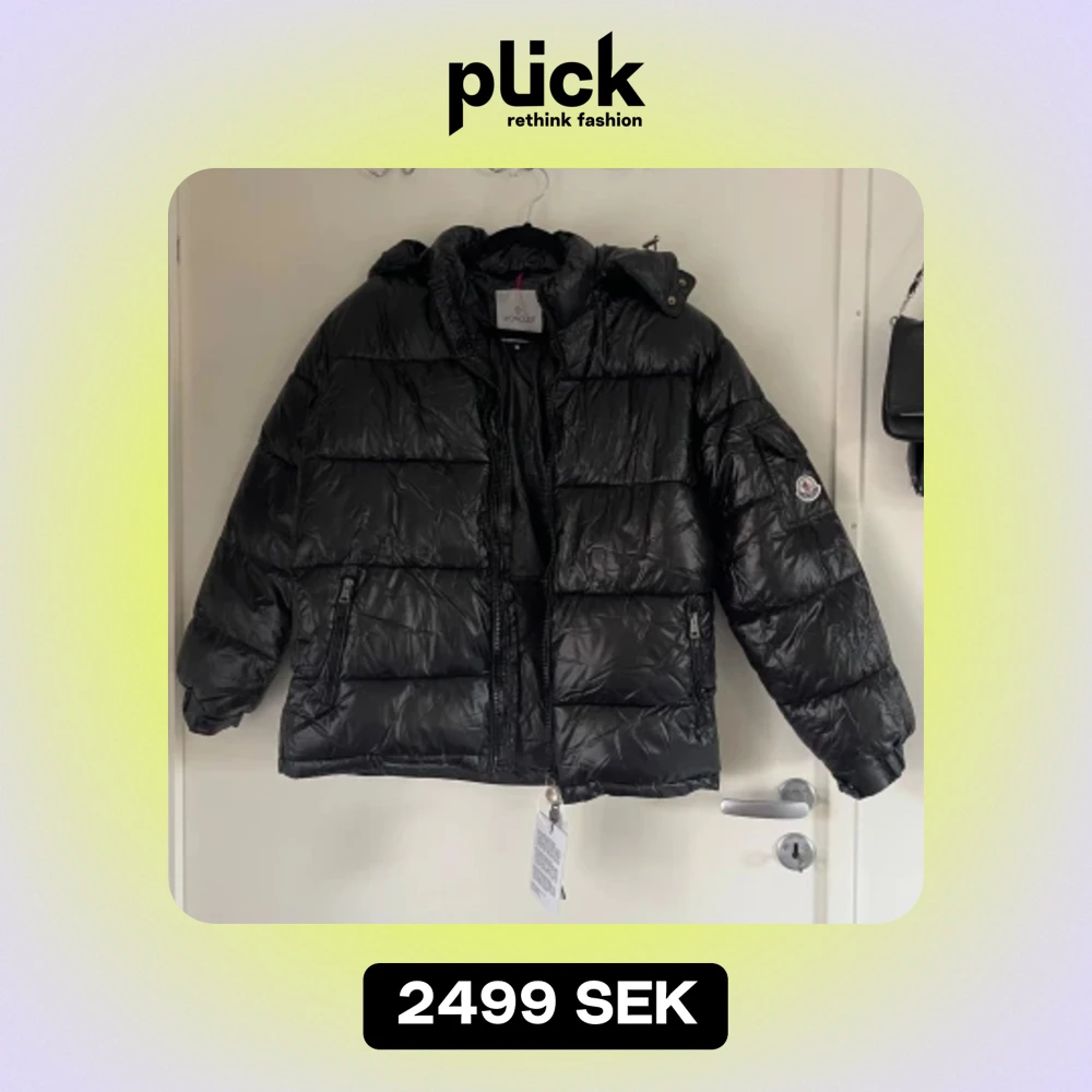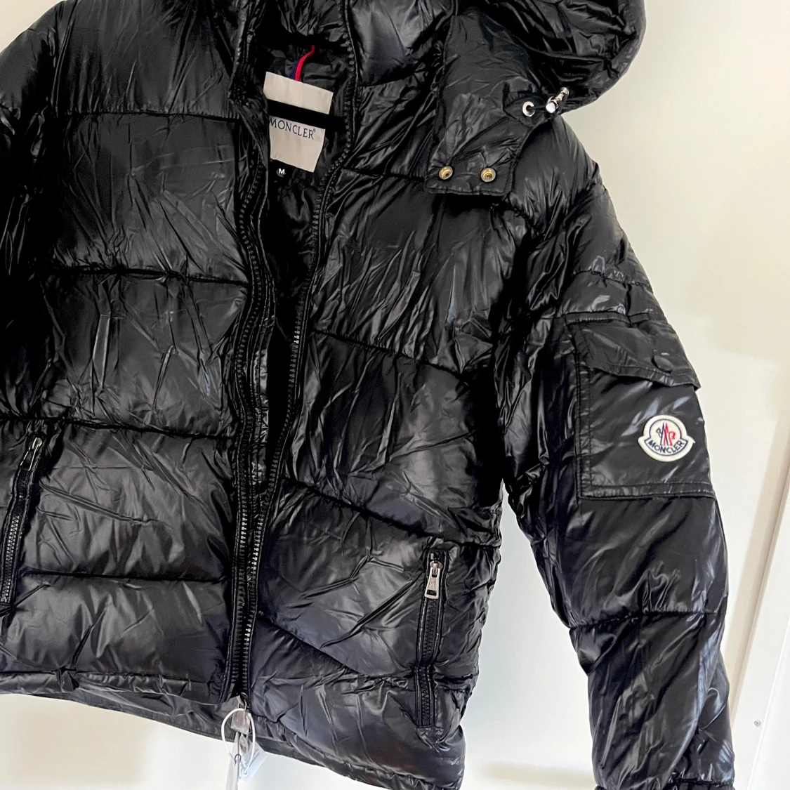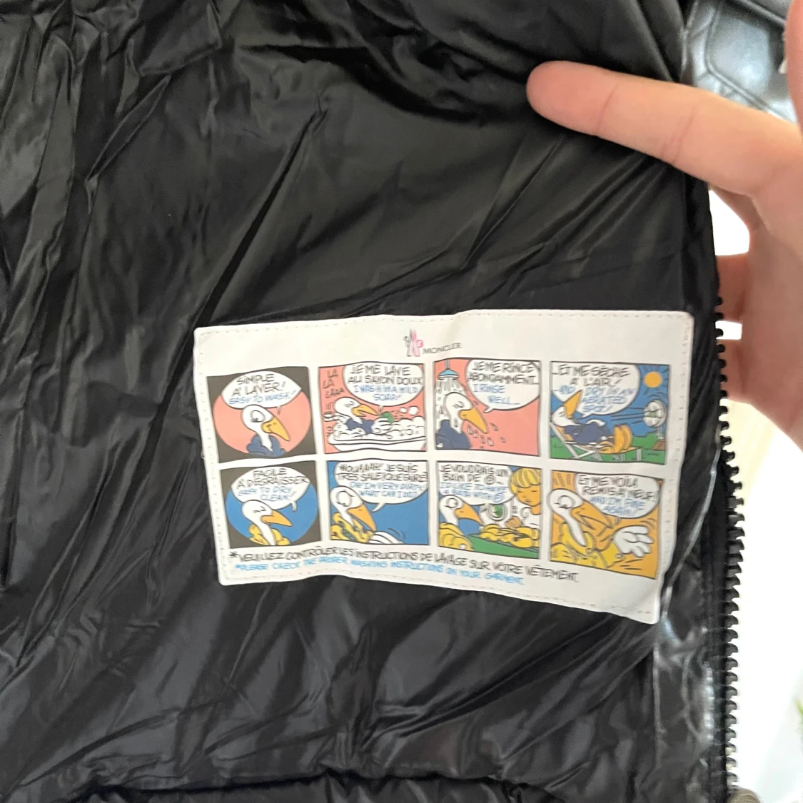 En svart dunjacka från Moncler med huva och dragkedja. Jackan har flera fickor med dragkedjor och en logotyp på vänster ärm. Insidan av jackan har en serieteckning. Qr koden funkar och man kan lägga mobilen på märket!