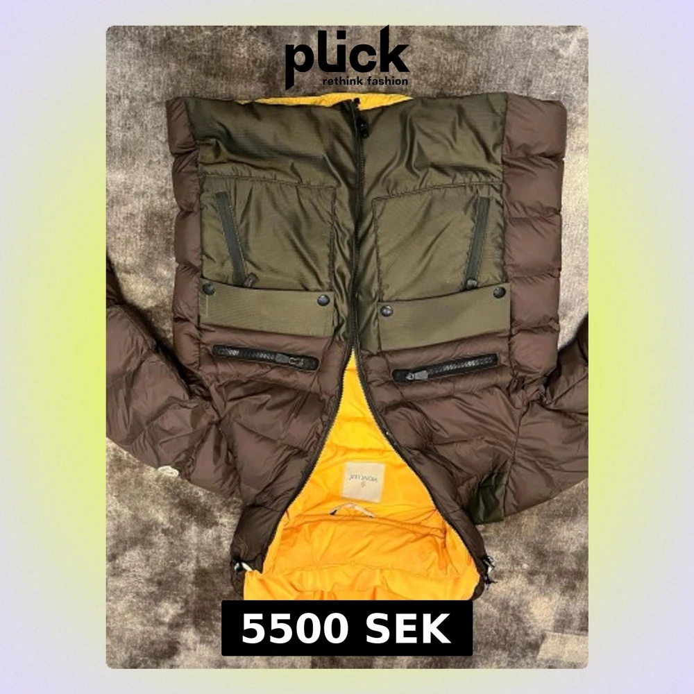Snygg pufferjacka från Moncler i brunt och olivgrönt med gul insida. Jackan har flera fickor med dragkedjor och knappar på bröstet, samt quiltad design och hög krage. Perfekt för kalla dagar med sin varma och vadderade insida.