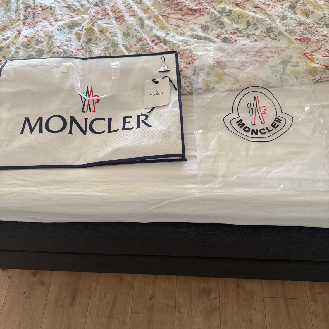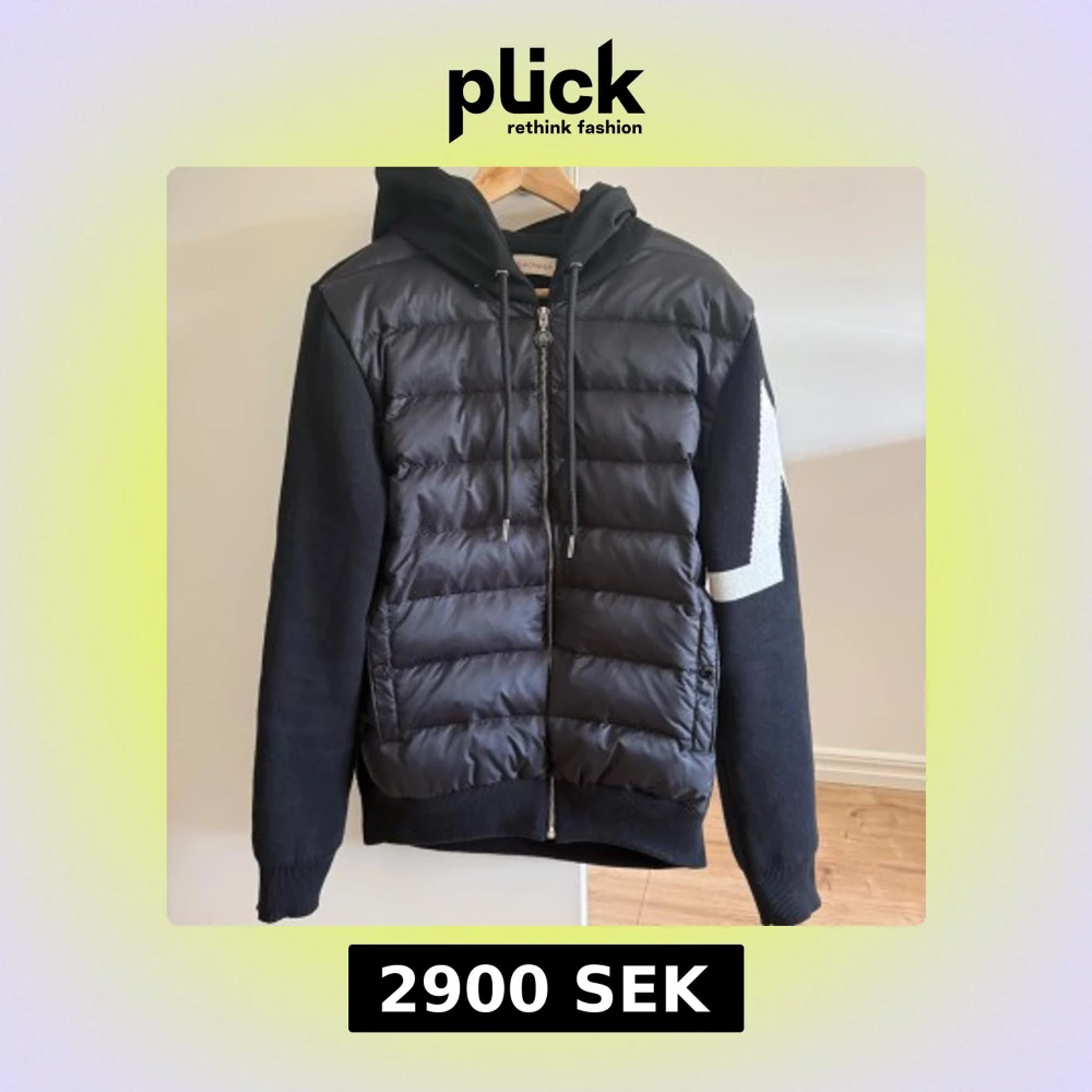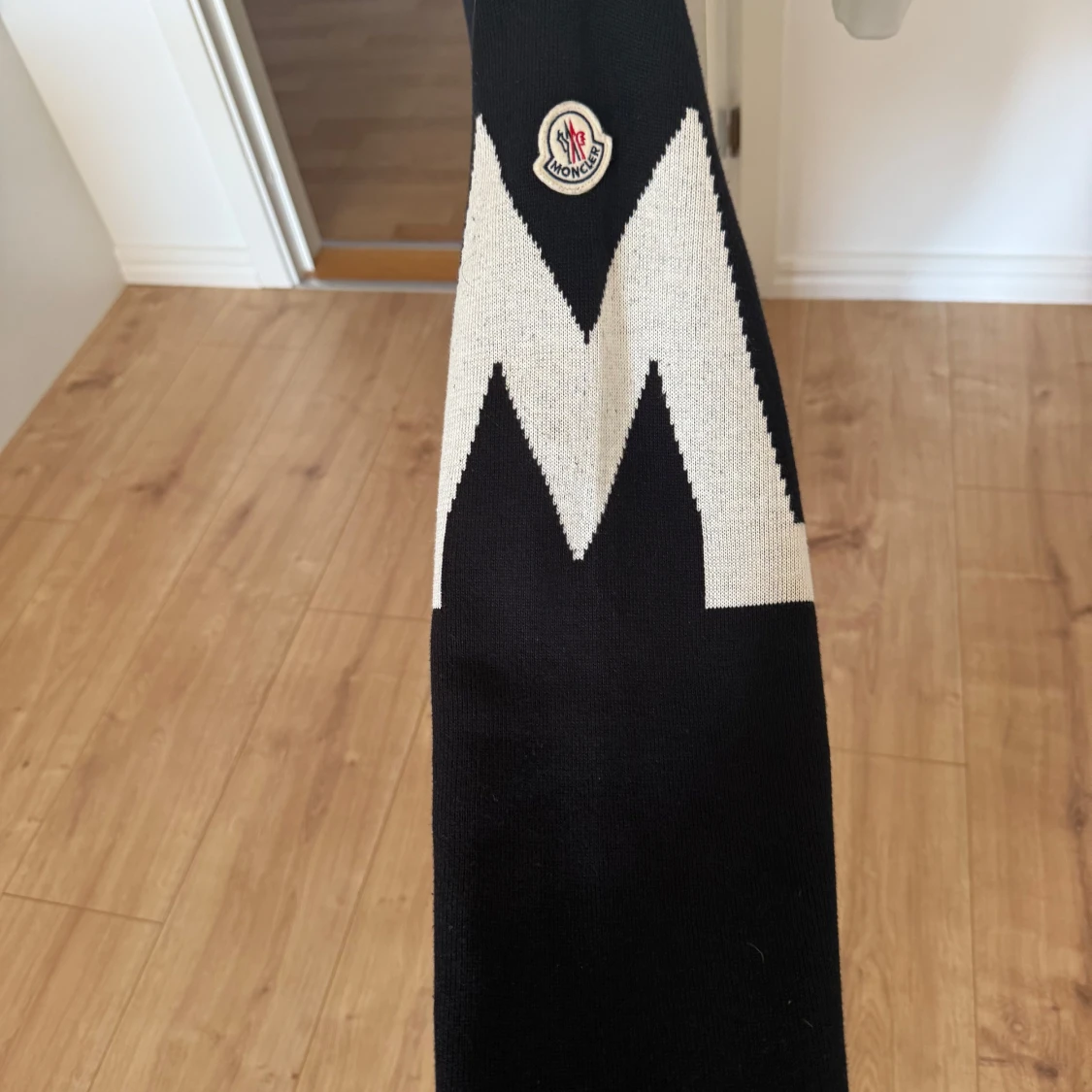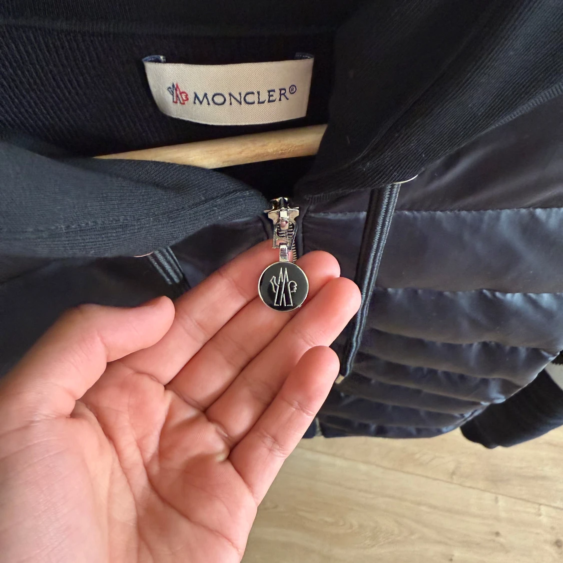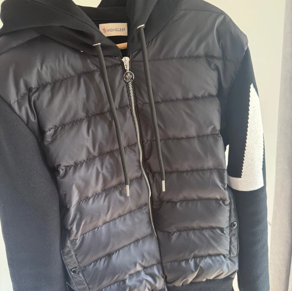 Säljer en snygg svart cardiganfrån Moncler med huva och dragkedja. Jackan har en quiltad framsida och långa ärmar med ett stort vitt M på ärmen. Perfekt för kyligare dagar och även lite varma dagar.Säljer den då jag inte använder den.Det är storlek m men passar även om du har storlek s