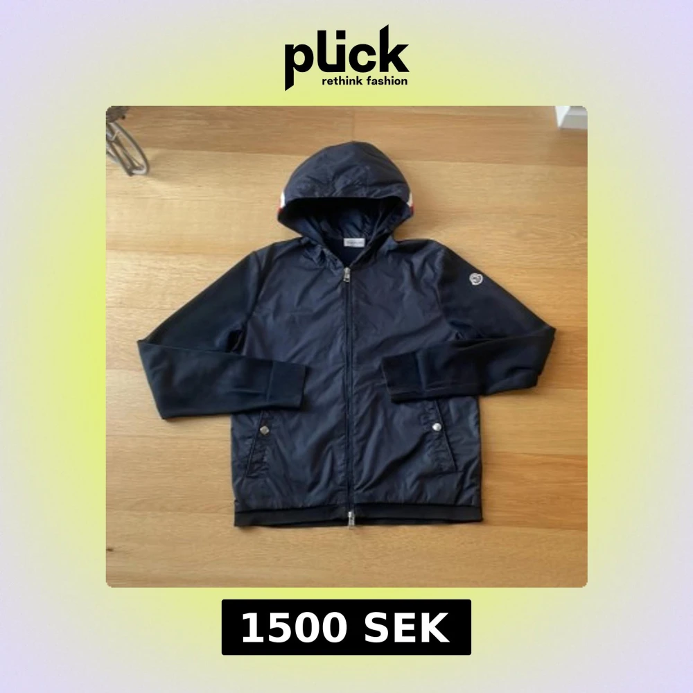 Snygg svart jacka från Moncler med huva och dragkedja. Jackan har långa ärmar och ribbade muddar. Den har också två fickor med knappar framtill och en diskret logga på ärmen. Perfekt för en stilren look. INTE SAMMA INLÄGG