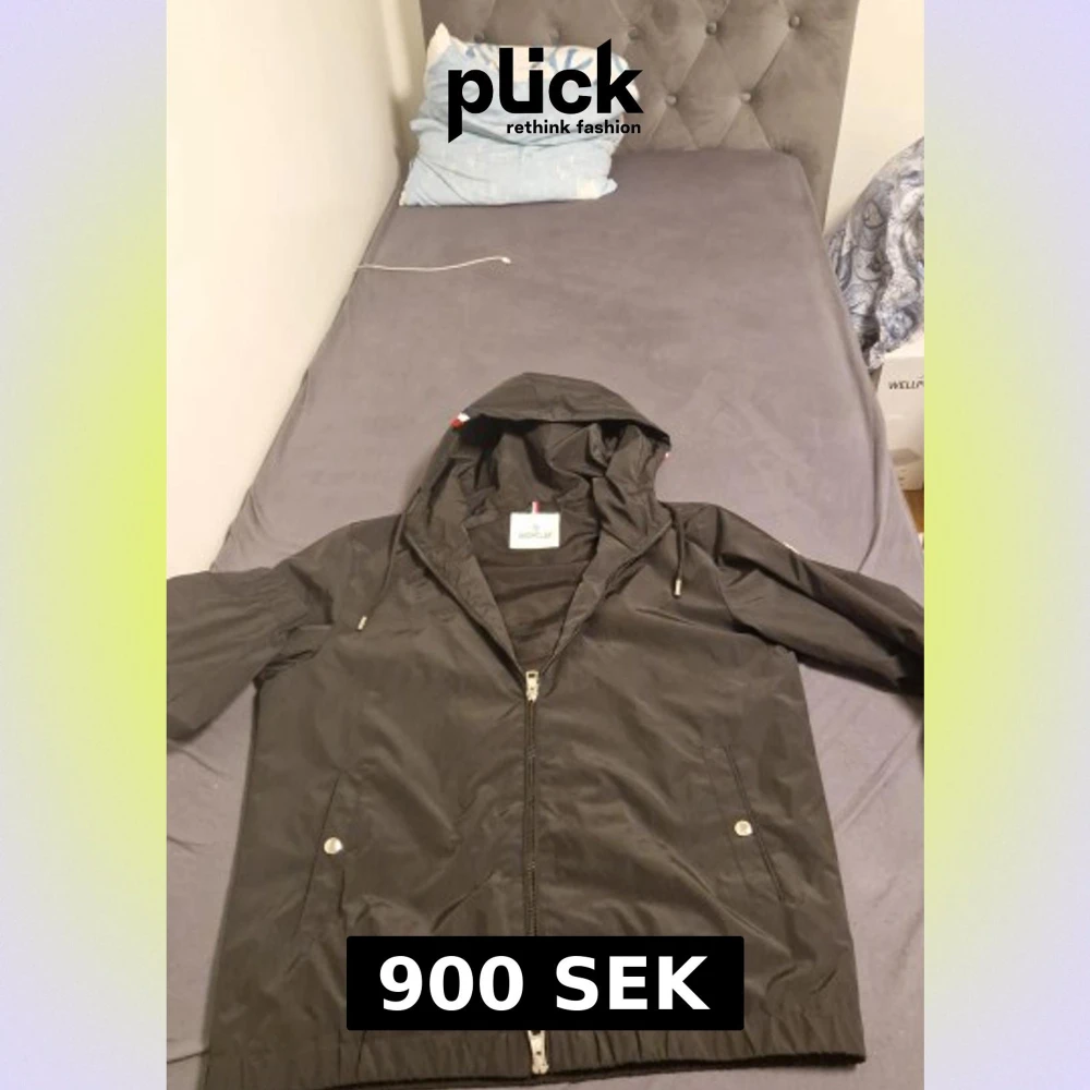 Svart vindjacka från Moncler med huva och dragkedja framtill. Jackan har två fickor med tryckknappar, elastiska muddar och diskret Moncler-logga på ärmen. Lätt och smidig modell i syntetmaterial, perfekt för blåsiga dagar.