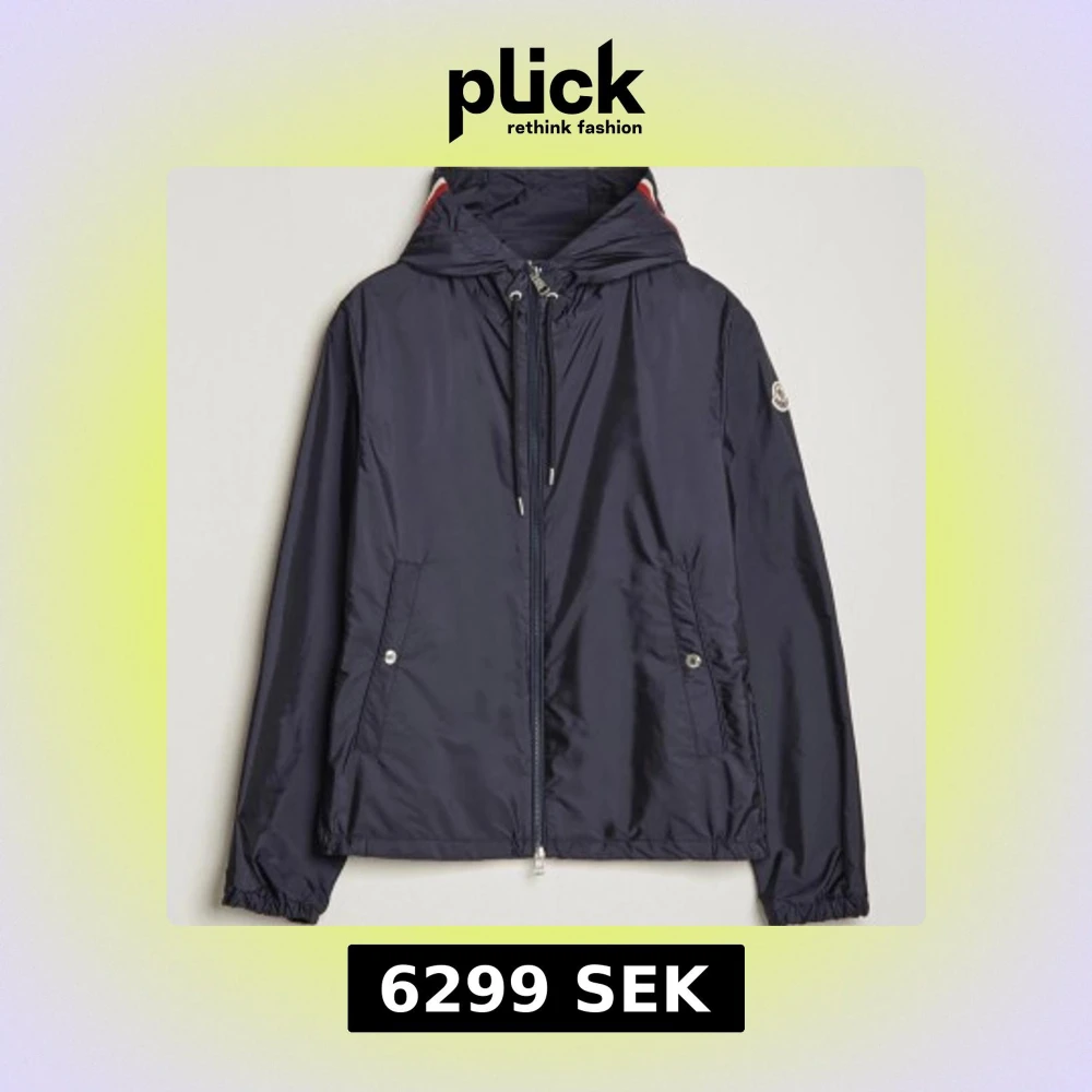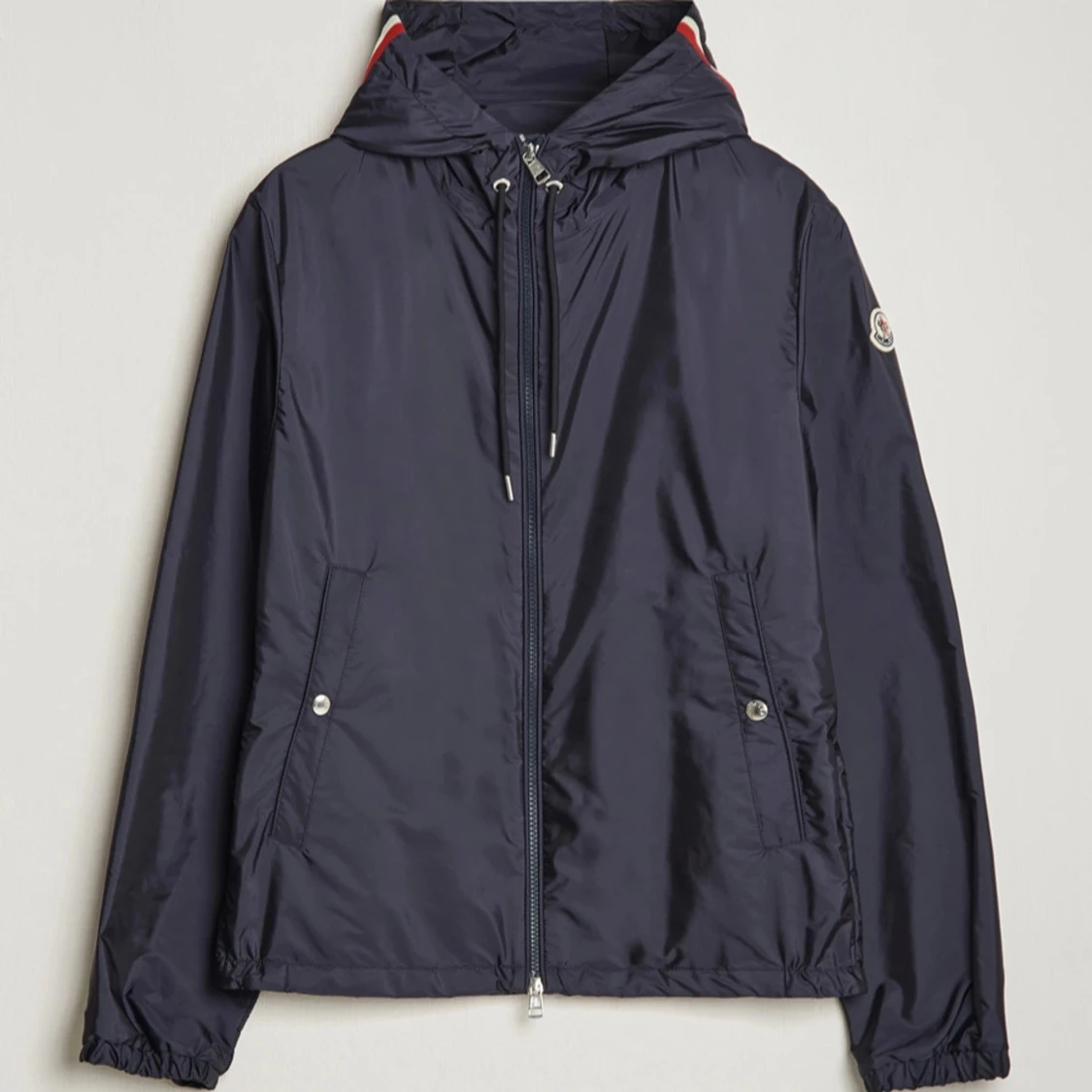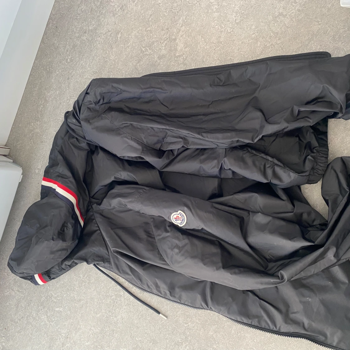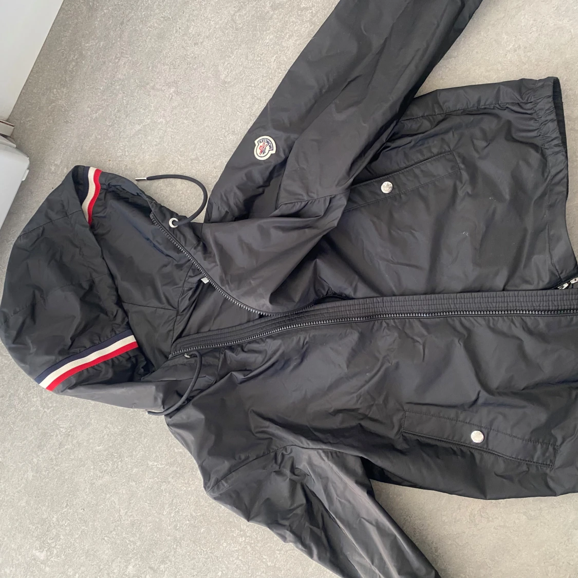 Snygg mörkblå vindjacka från Moncler med huva och dragsko. Jackan har dragkedja framtill, två fickor med knappar och Moncler-logga på ärmen. Perfekt för blåsiga dagar. Självklart äkta kan tänka mig gå ner i pris vid snabbt affär. Använd 2-3 gånger.