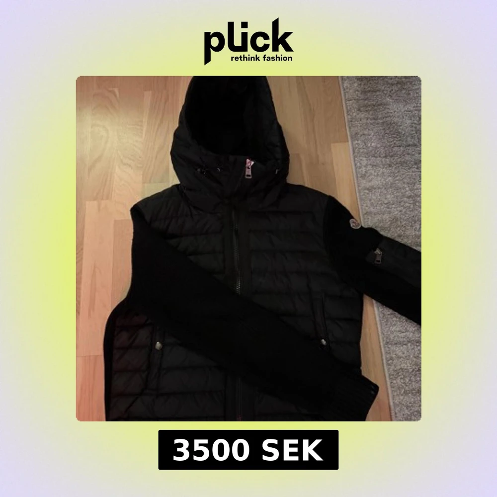 Svart pufferjacka från Moncler med stickade ärmar och vadderad kropp. Jackan har huva med dragsko, dragkedja framtill och Moncler-logga på ärmen. Snygga detaljer som dragkedjeficka på ärmen och ribbade muddar. Perfekt för kalla dagar och riktigt stilren look. Snabb affär=bättre pris!
