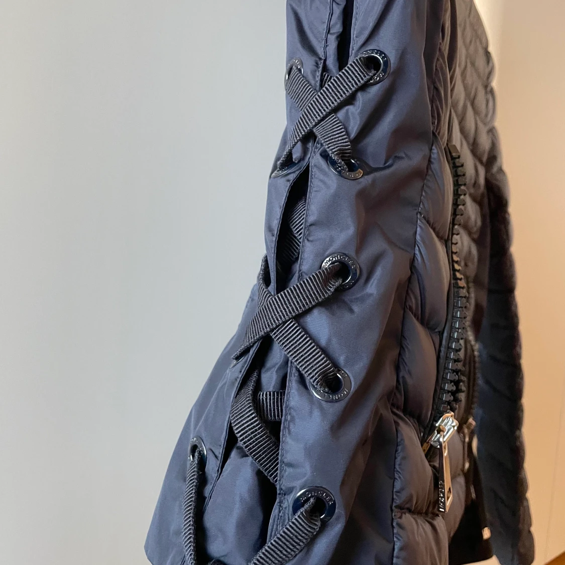 Marinblå vårjacka från Moncler med snörning på sidan, superfint skick och använd i två vårar. Inga defekter. Orginalpris: 8550kr
