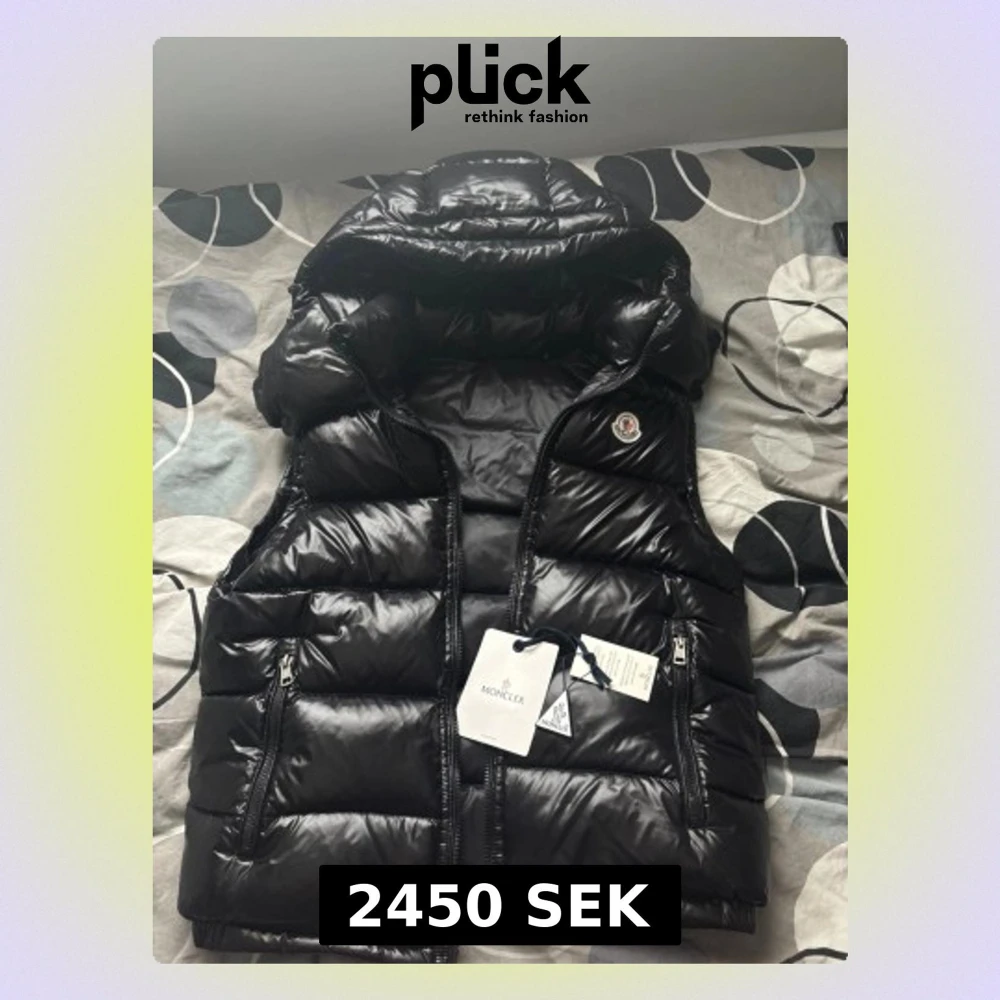 Svart glansig dunväst från Moncler med avtagbar huva, två dragkedjefickor och klassisk logga på bröstet. Västen har quiltad design och dubbla dragkedjor framtill. Perfekt för lager-på-lager och streetstyle.