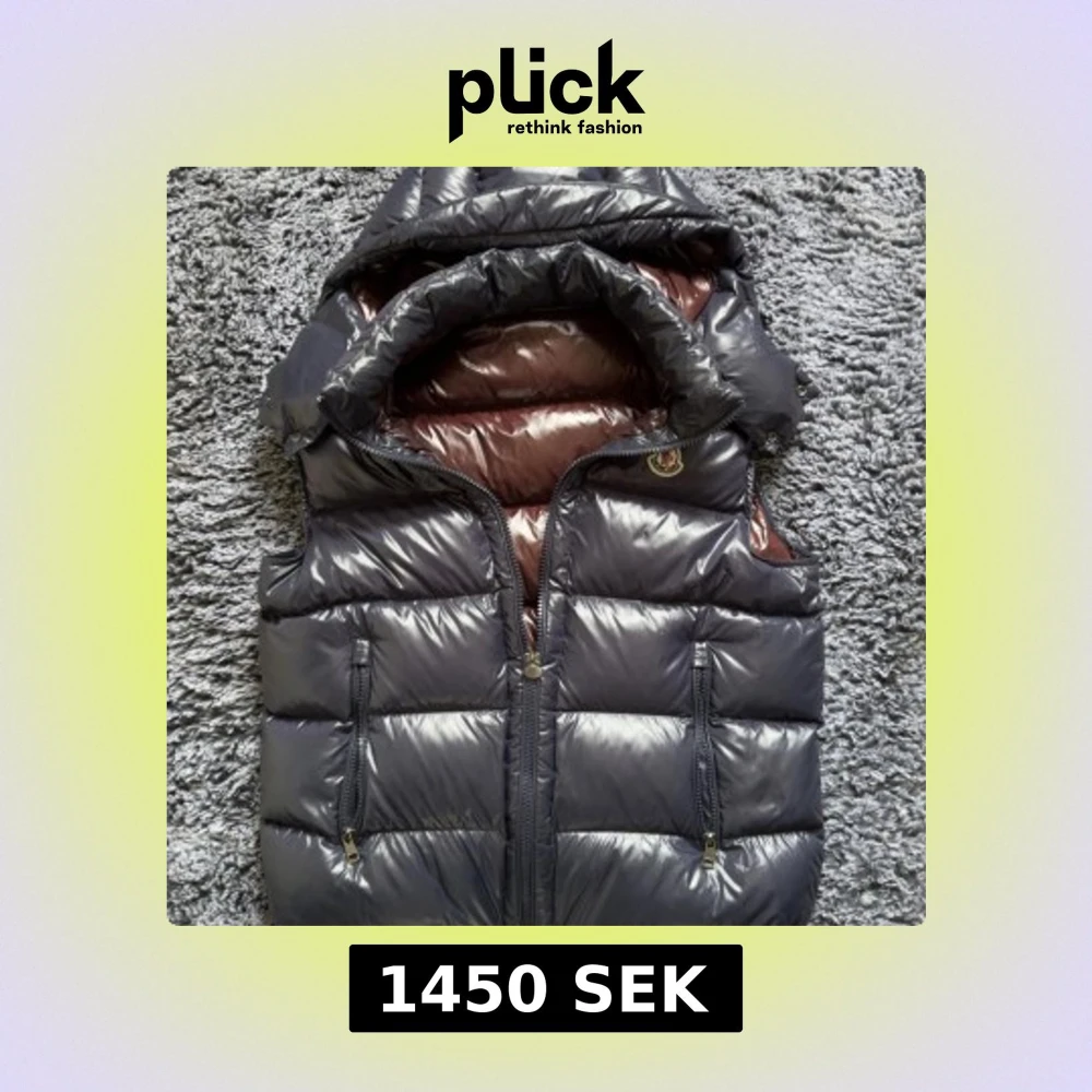 Säljer en svart glansig dunväst från Moncler med avtagbar huva och två dragkedjefickor framtill. Västen har Moncler-logga på bröstet och ett brunt innerfoder med serietidningsdetalj. Perfekt för lager-på-lager under kyliga dagar.