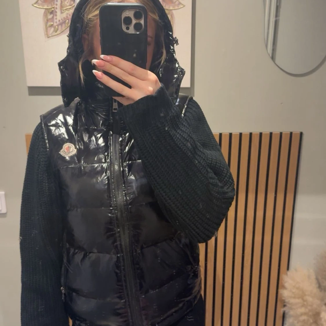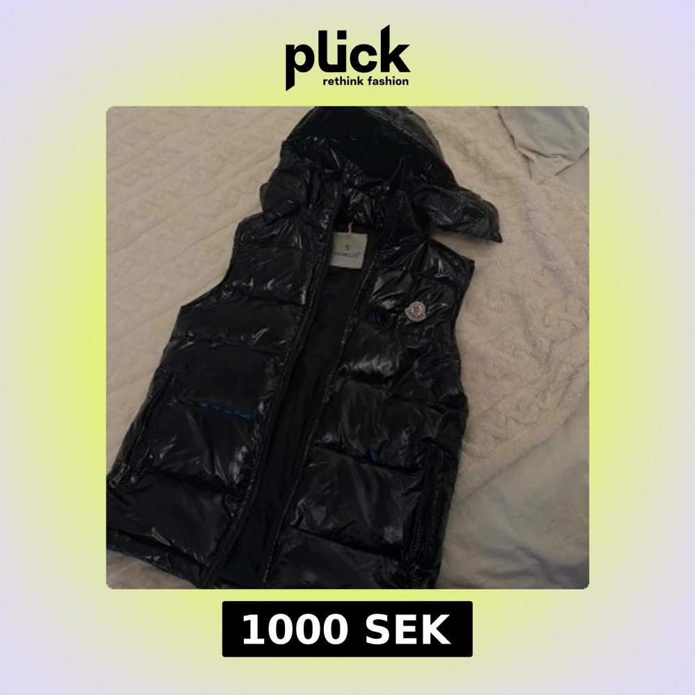 Snygg svart glansig dunväst från Moncler med avtagbar huva. Västen har dragkedja framtill, två fickor med dragkedja och moncler logga. Otroligt skön och i nyskick!! 🖤 Fraktar snabbt! Jag har kunnat haft den på vintern också med varmare tröjor under