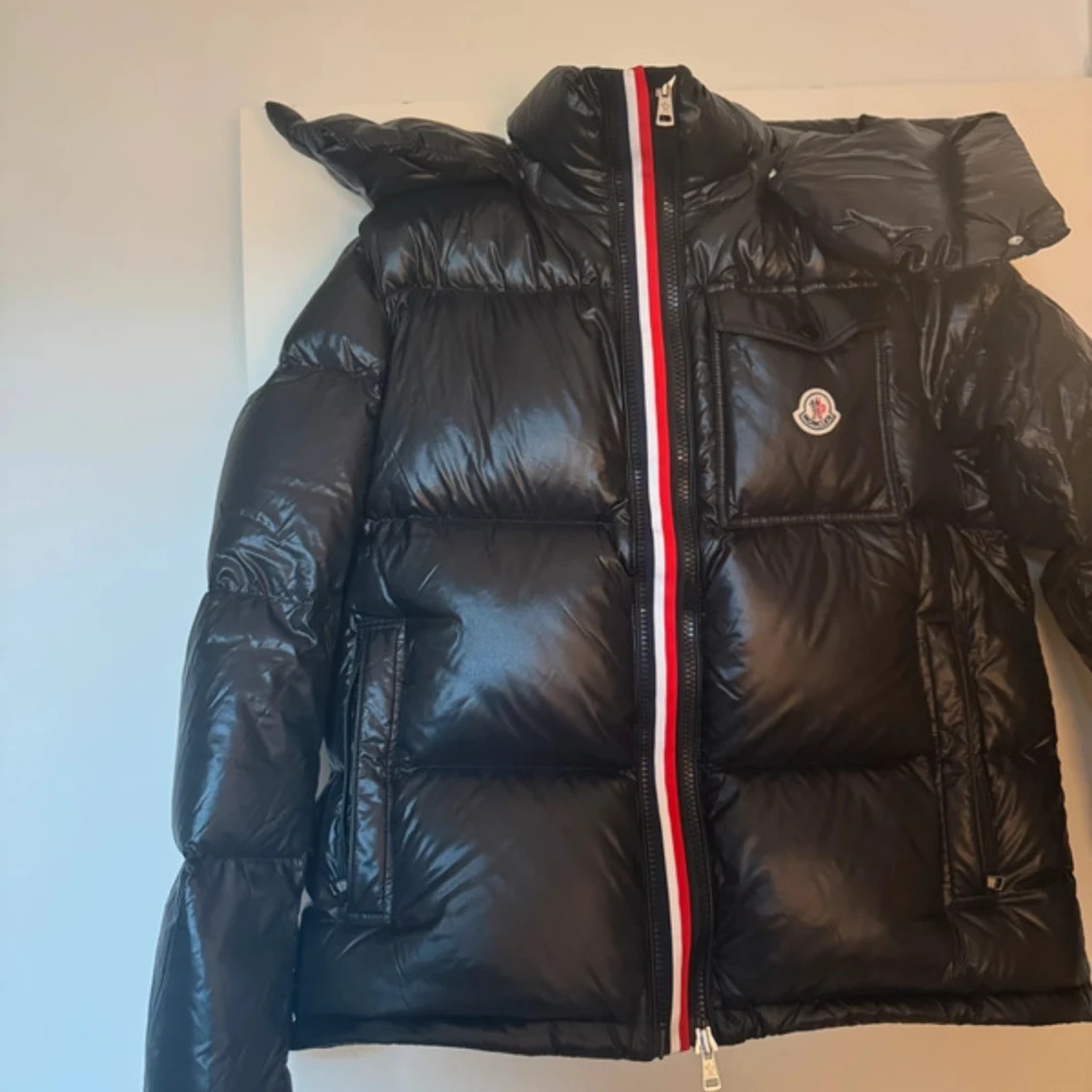 Säljer en svart, glansig dunjacka från Moncler med klassisk logotyp på bröstet och rödvit dragkedja. Jackan har hög krage och stora, vadderade sektioner som ger en puffer-look. Perfekt för kalla dagar.