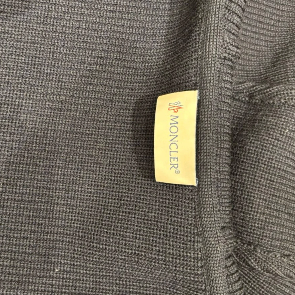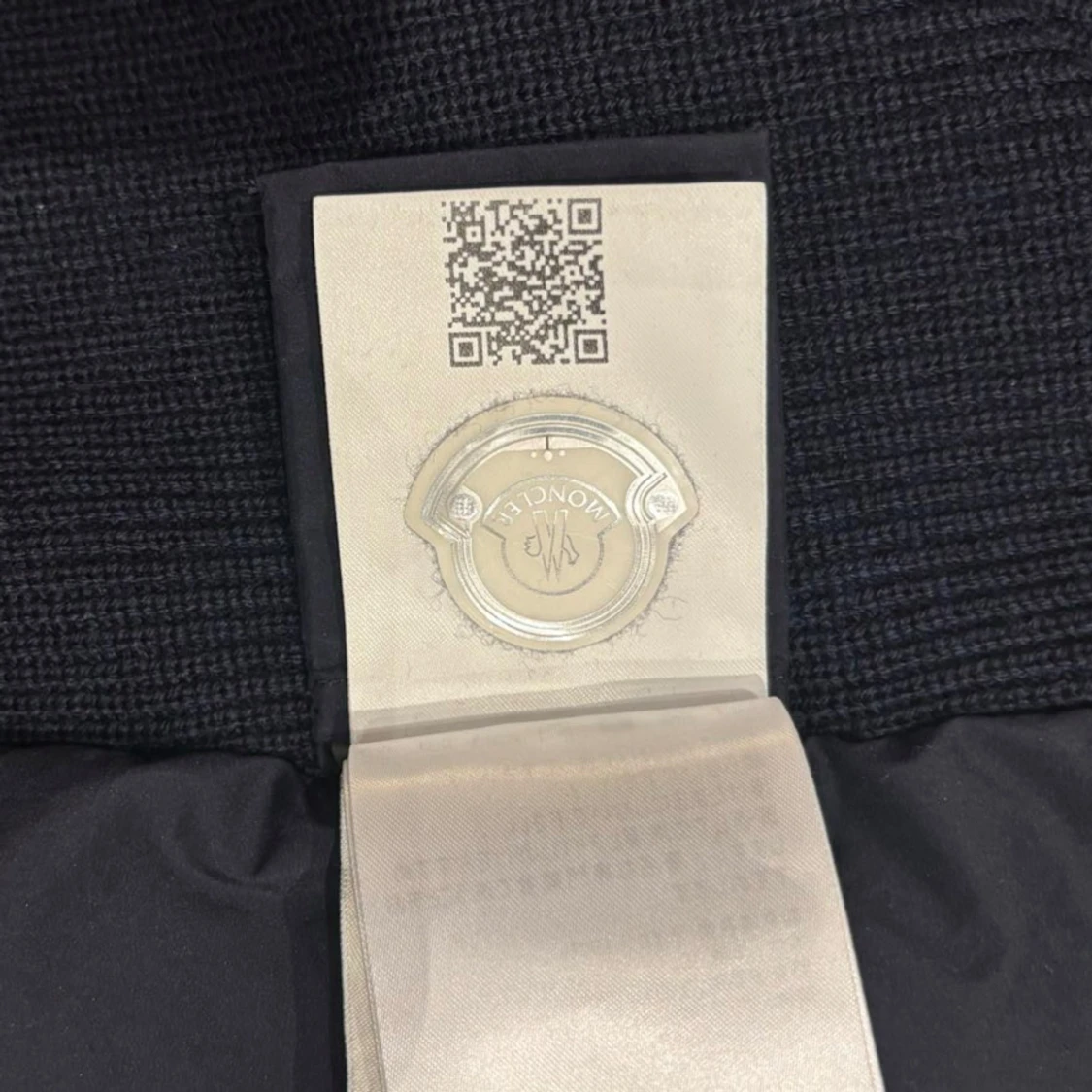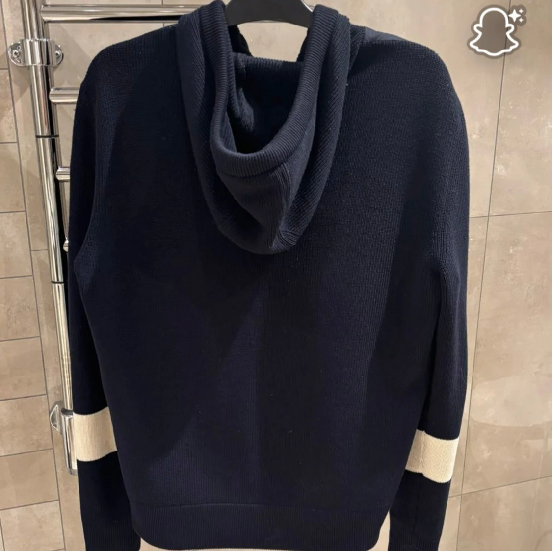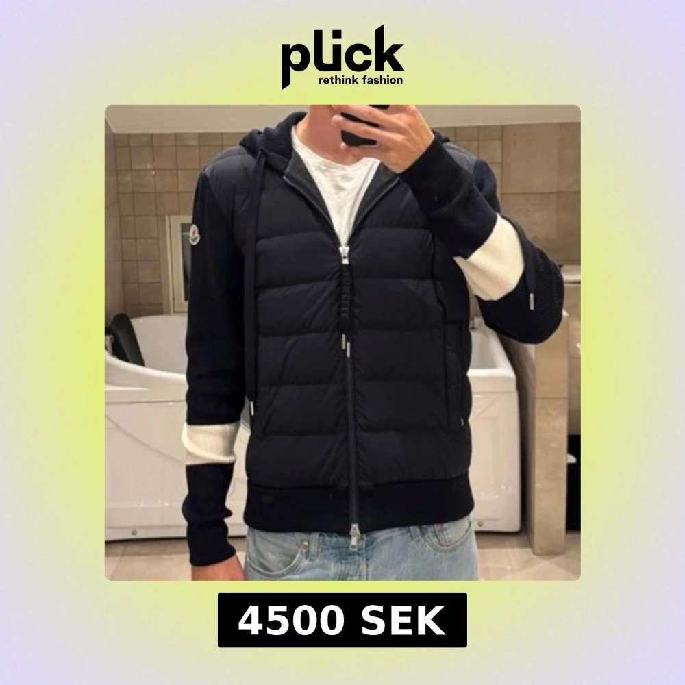 Snygg mörkblå jacka från Moncler med quiltad dunfront och stickade ärmar samt huva. Ärmarna har vita detaljer och dragkedja på sidan. Jackan har hel dragkedja framtill och en clean, sportig look som funkar till jeans och sneakers. Storlek L , kan gå ner i pris🤗