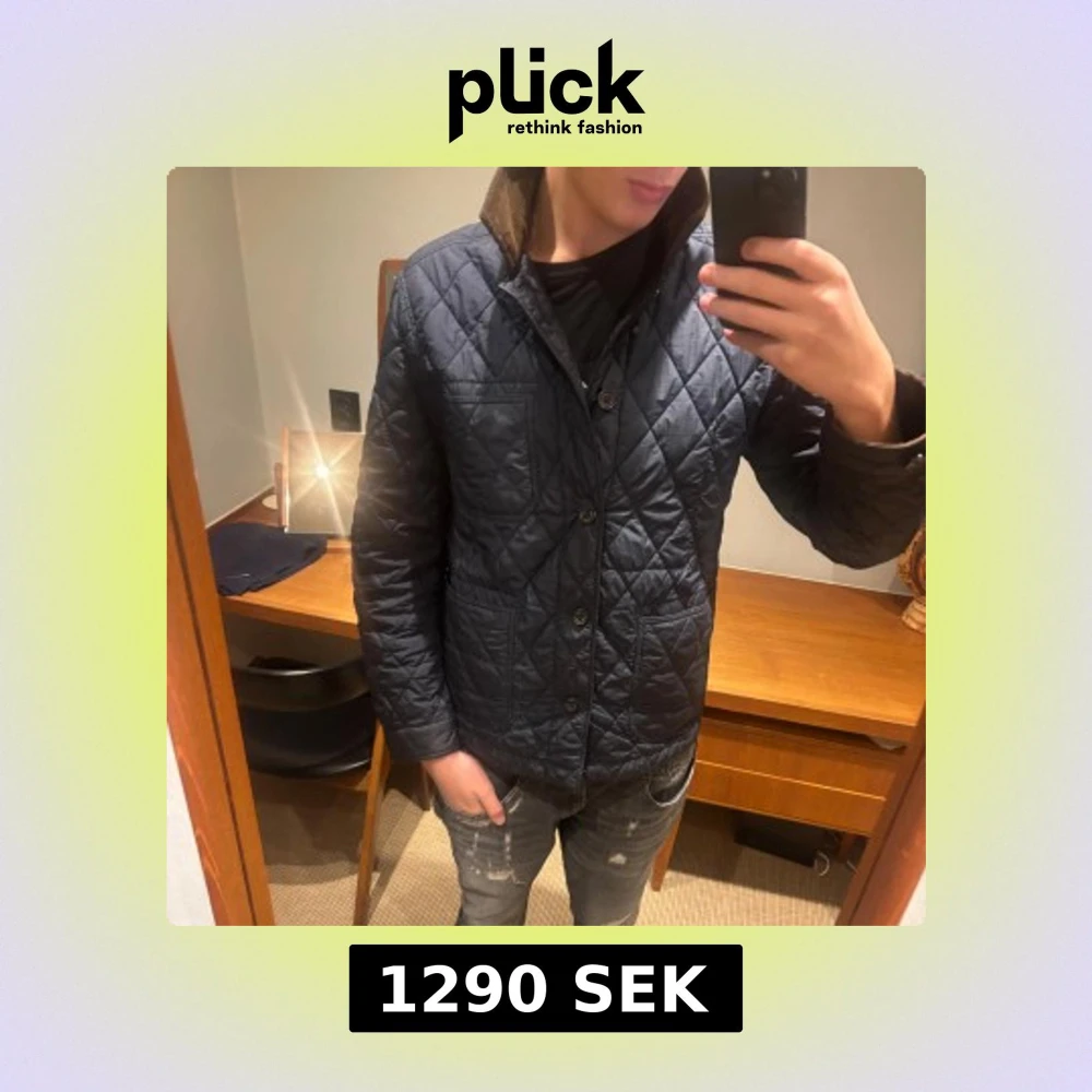 Quiltad mörkblå jacka från Polo Ralph Lauren med bruna manchesterdetaljer på kragen. Jackan har knappar framtill, tre fickor och ett Polo-emblem på ärmen. Perfekt för höst och vinter, snygg och klassisk stil med loose passform.