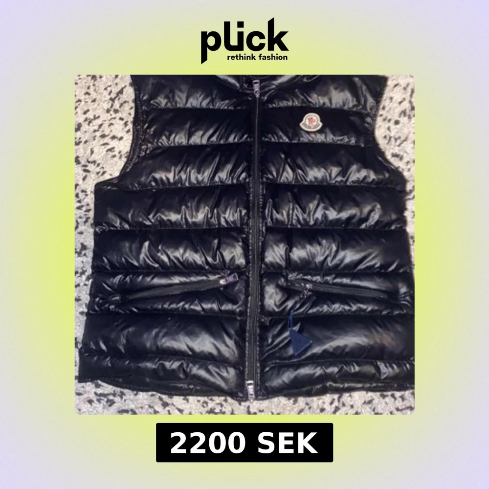 Snygg svart dunväst från Moncler med glansig finish och quiltad design. Västen har två dragkedjefickor framtill, hög krage och klassisk Moncler-logga på bröstet. Perfekt att slänga över en hoodie för en cool look.