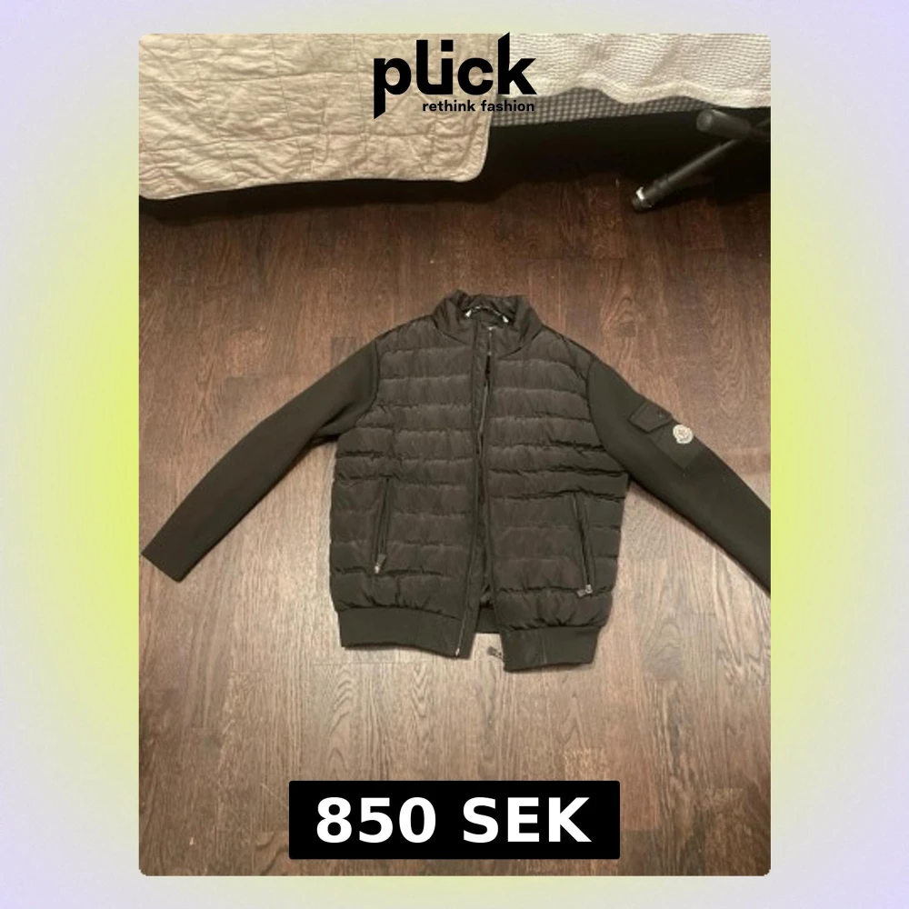 Säljer en svart pufferjacka från Moncler med quiltad kropp och släta ärmar. Jackan har dragkedja framtill, två sidofickor med dragkedja och en Moncler-logga på ärmen. Perfekt för dig som vill ha en clean och stilren look.