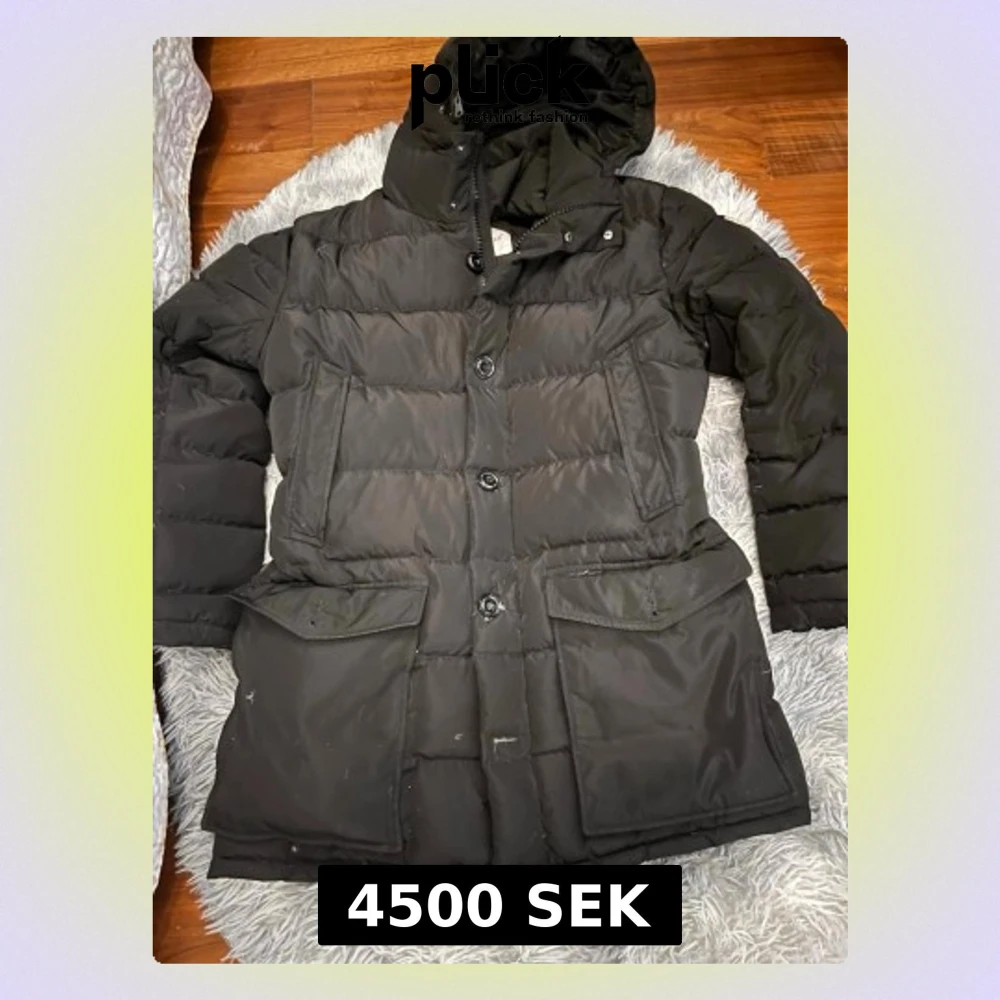 Säljer en svart dunjacka från Moncler med huva och stora fickor framtill. Jackan har både dragkedja och knappar, samt det klassiska Moncler-logotypen på ärmen. Perfekt för kalla dagar och riktigt snygg till vinterlooken.