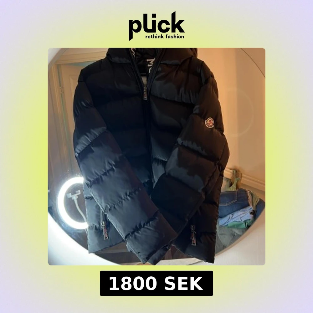 Säljer en svart pufferjacka från Moncler i storlek S. Jackan har huva, dragkedja framtill och logga på ärmen. Insidan av huvan har Moncler-tryck. Jackan är vadderad och perfekt för kalla dagar.