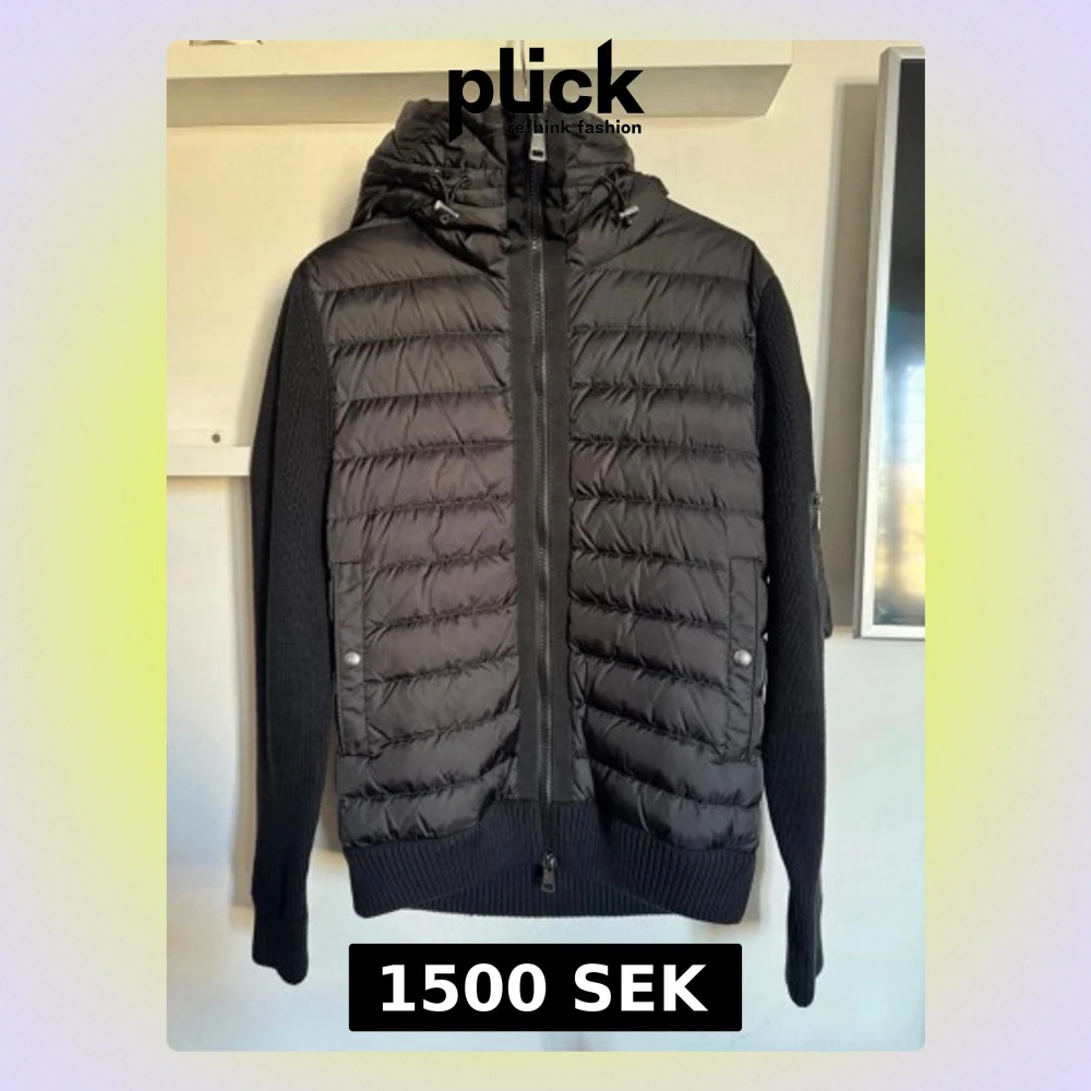 Säljer en svart hybridjacka från Moncler med quiltad front och huva i pufferstil. Ärmar och rygg är stickade för extra komfort och stil. Jackan har dragkedja framtill, sidofickor med tryckknappar och en liten ficka på ärmen. Perfekt för dig som vill ha både värme och streetstyle.