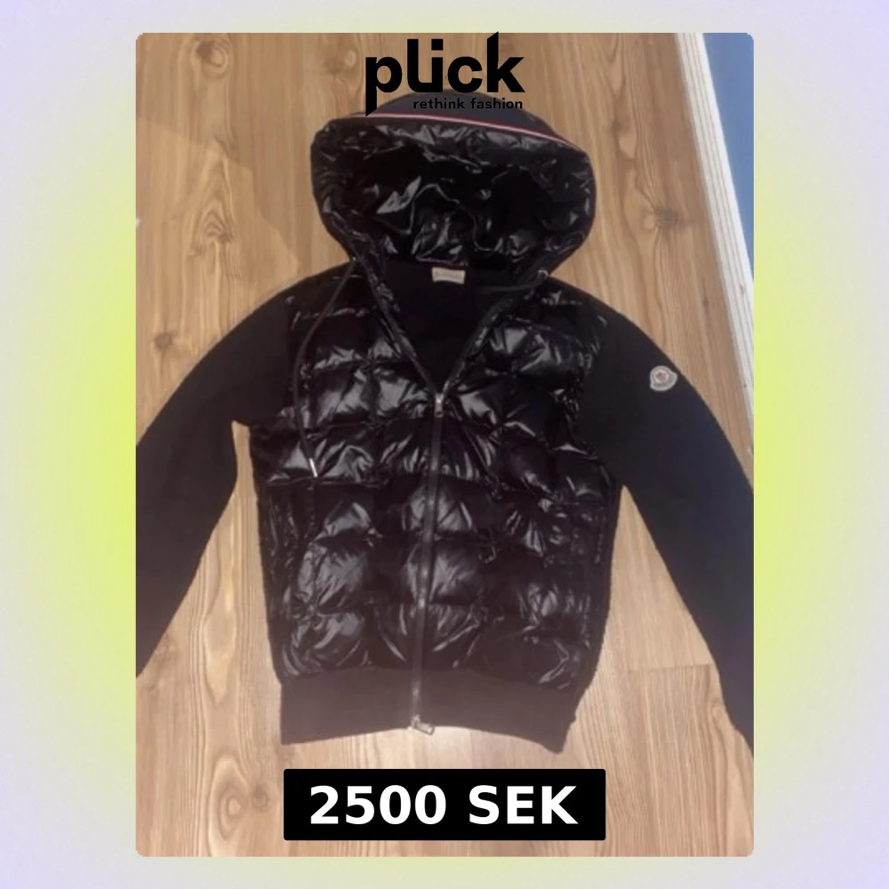 Snygg svart dunjacka från Moncler med glansig quiltad front och huva. Jackan har dragkedja framtill, Moncler-logga på ärmen och mjuka ärmar i kontrasterande material. Perfekt för kalla dagar och riktigt stilren look. Priset kan diskuteras vid snabb affär