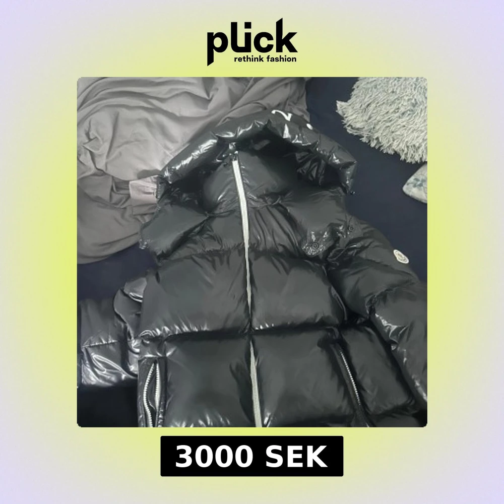 Säljer en svart pufferjacka från Moncler med glansig finish och stor huva. Jackan har tydliga quiltade partier, dragkedjor i silver och Moncler-logga på ärmen. Perfekt för kalla dagar och har en riktigt schysst streetstil.