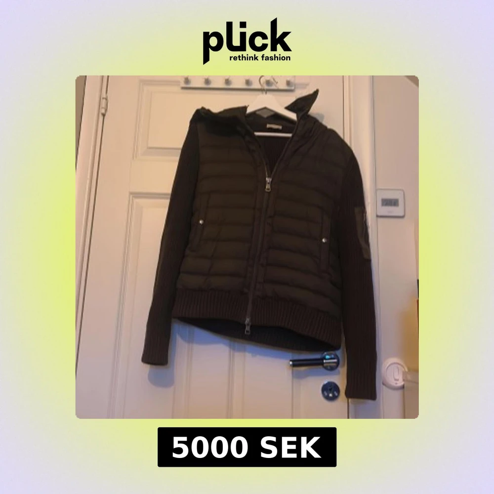 Säljer en mörkgrön pufferjacka från Moncler med stickade ärmar och quiltad kropp. Jackan har huva, dragkedja framtill och Moncler-logga på ärmen. Perfekt för kyliga dagar och snygg till streetwear. Har också kvitto