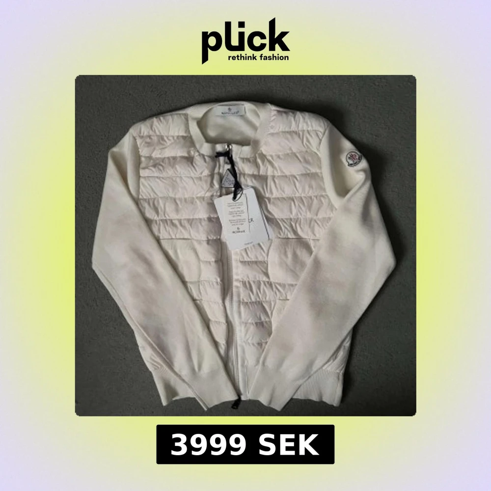 Exklusiv vit jacka från Moncler med quiltad front och ärmar i mjuk stickad kvalitet. Tröjan har dragkedja framtill, rund halsringning och Moncler-logga på ärmen. Kvitto och dustbag ingår.