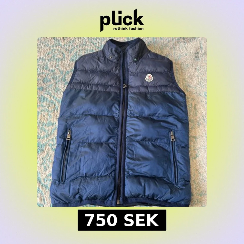 Snygg marinblå dunväst från Moncler med klassisk logga på bröstet. Västen har hög krage, två fickor med dragkedja och quiltad design. Perfekt för lager-på-lager och ger en sportig vibe. Innerfoder med serietidningsmönster och autenticitetsmärkning.