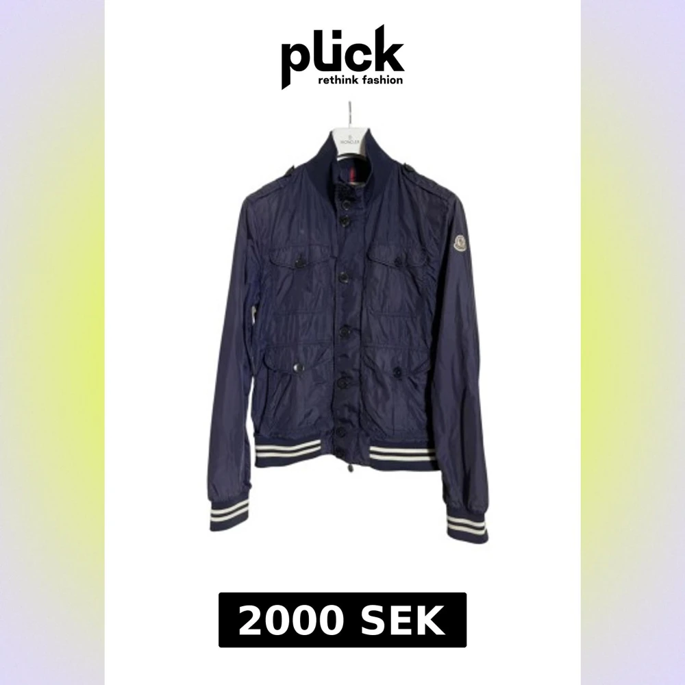 Snygg marinblå vindjacka från Moncler med ribbad krage och muddar med vita ränder. Jackan har fyra fickor framtill med knappar, dragkedja och Moncler-logga på ärmen.