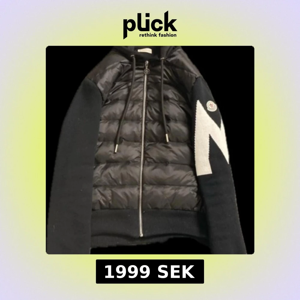 Snygg svart pufferjacka från Moncler med stickade ärmar och stor vit M-detalj på ena ärmen. Jackan har dragkedja framtill, huva med dragsko och ribbade muddar. Perfekt för dig som vill ha en sportig och trendig look. Jagckan har en konstig lukt som inte går att få bort. ÄR ÖPPEN FÖR BYTEN!!