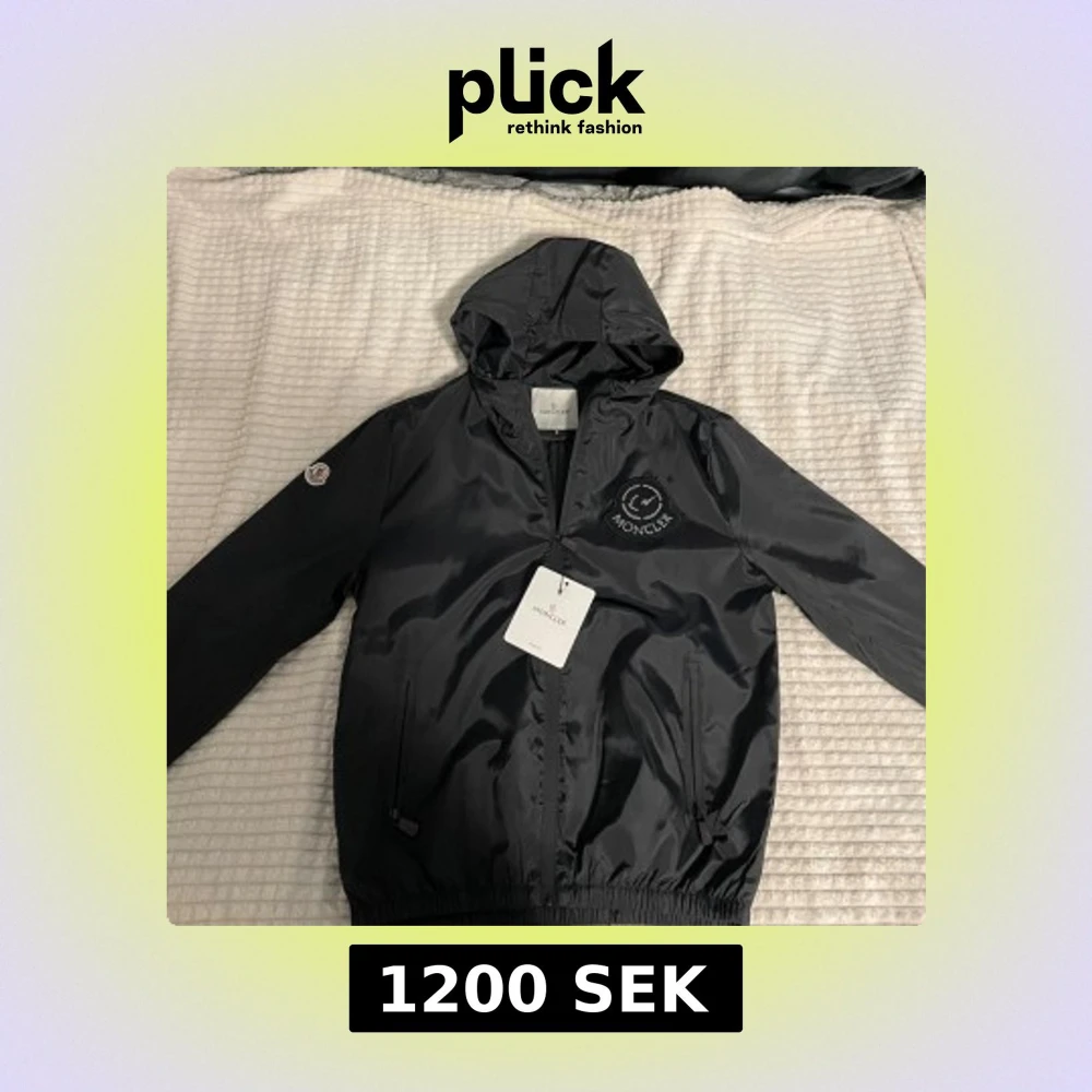 Svart vindjacka från Moncler med huva och dragkedja framtill. Jackan har Moncler-logga på bröstet och ärmen, samt två sidofickor med dragkedja. Materialet är glansigt och känns lätt, perfekt för blåsiga dagar.