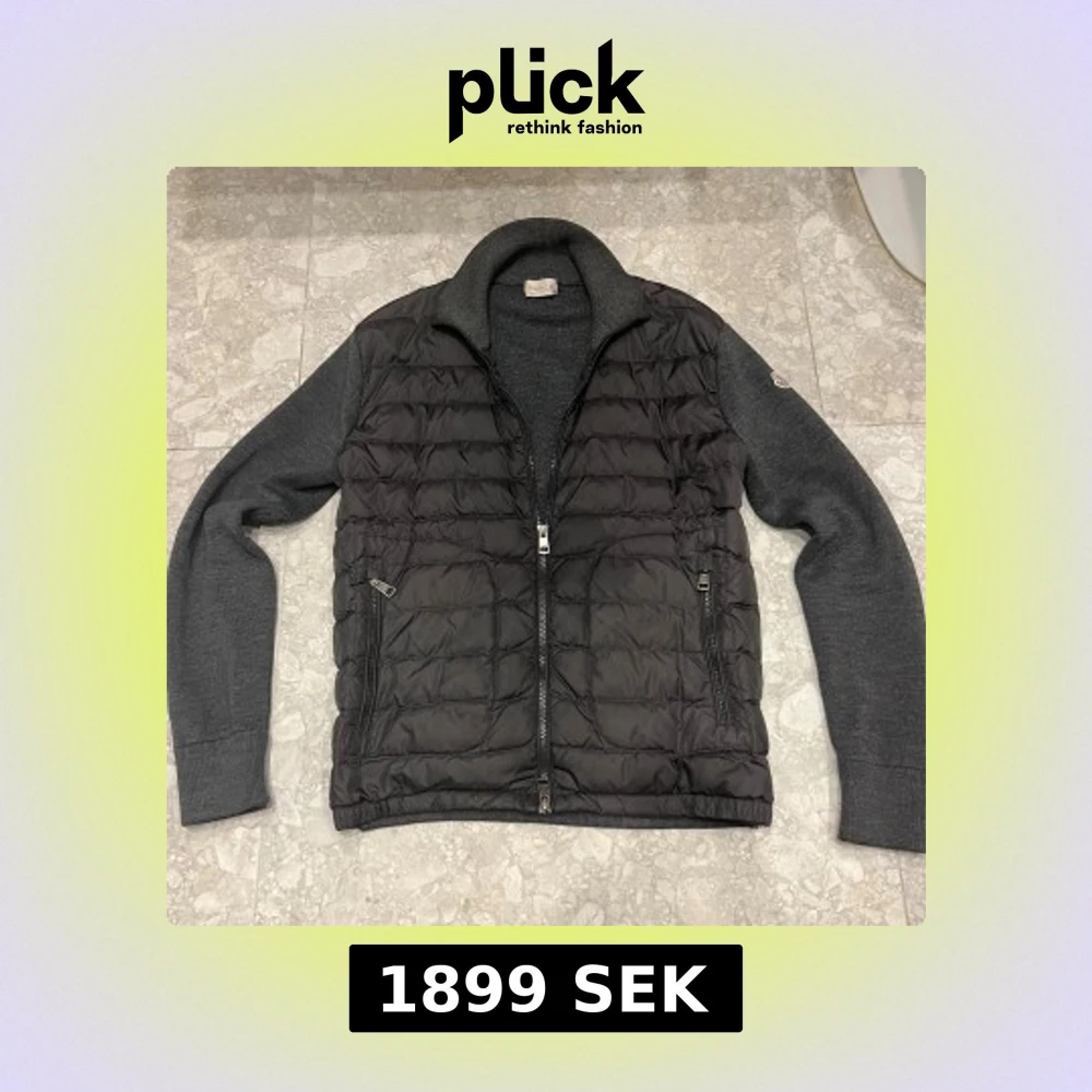 har några hål på vissa ställen men inga som syns när man har på sig jackan. fråga om bilder. har kvitto Snygg mörkgrå pufferjacka från Moncler med quiltad framsida och stickade ärmar. Jackan har två dragkedjefickor, hög krage och Moncler-logga på ärmen. Materialmix av polyester och stickad ull ger både värme och stil. Perfekt för dig som vill ha en clean look.
