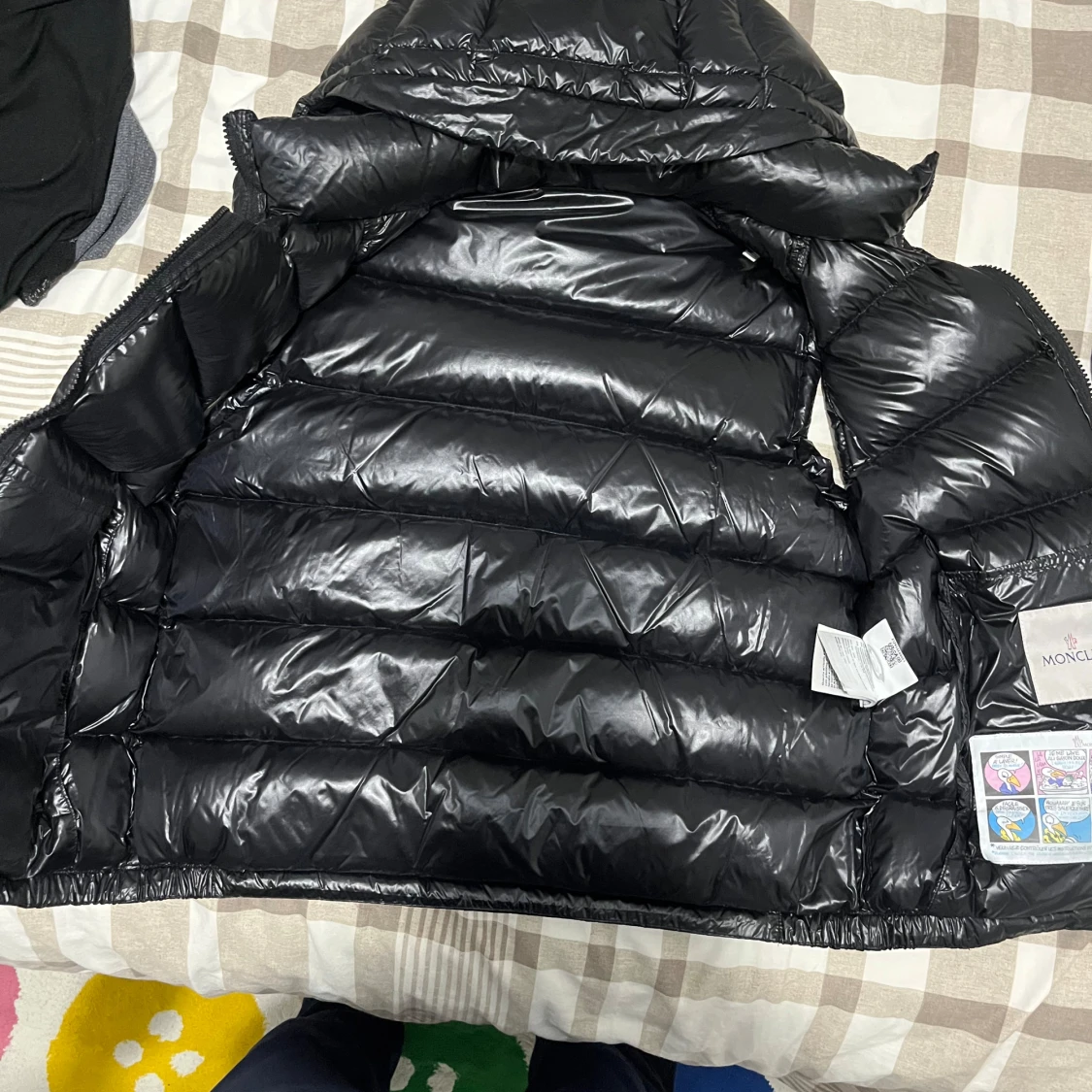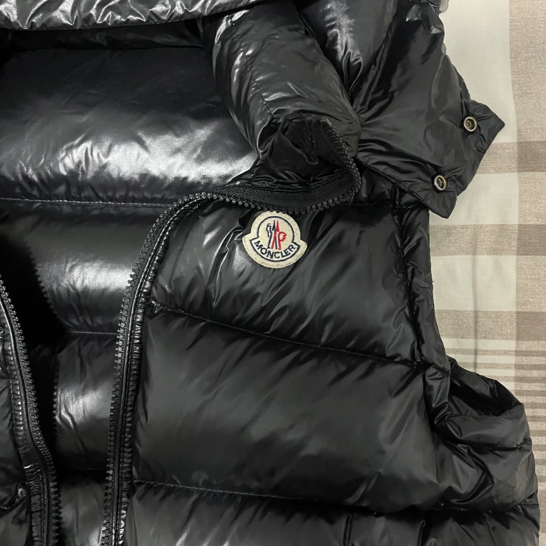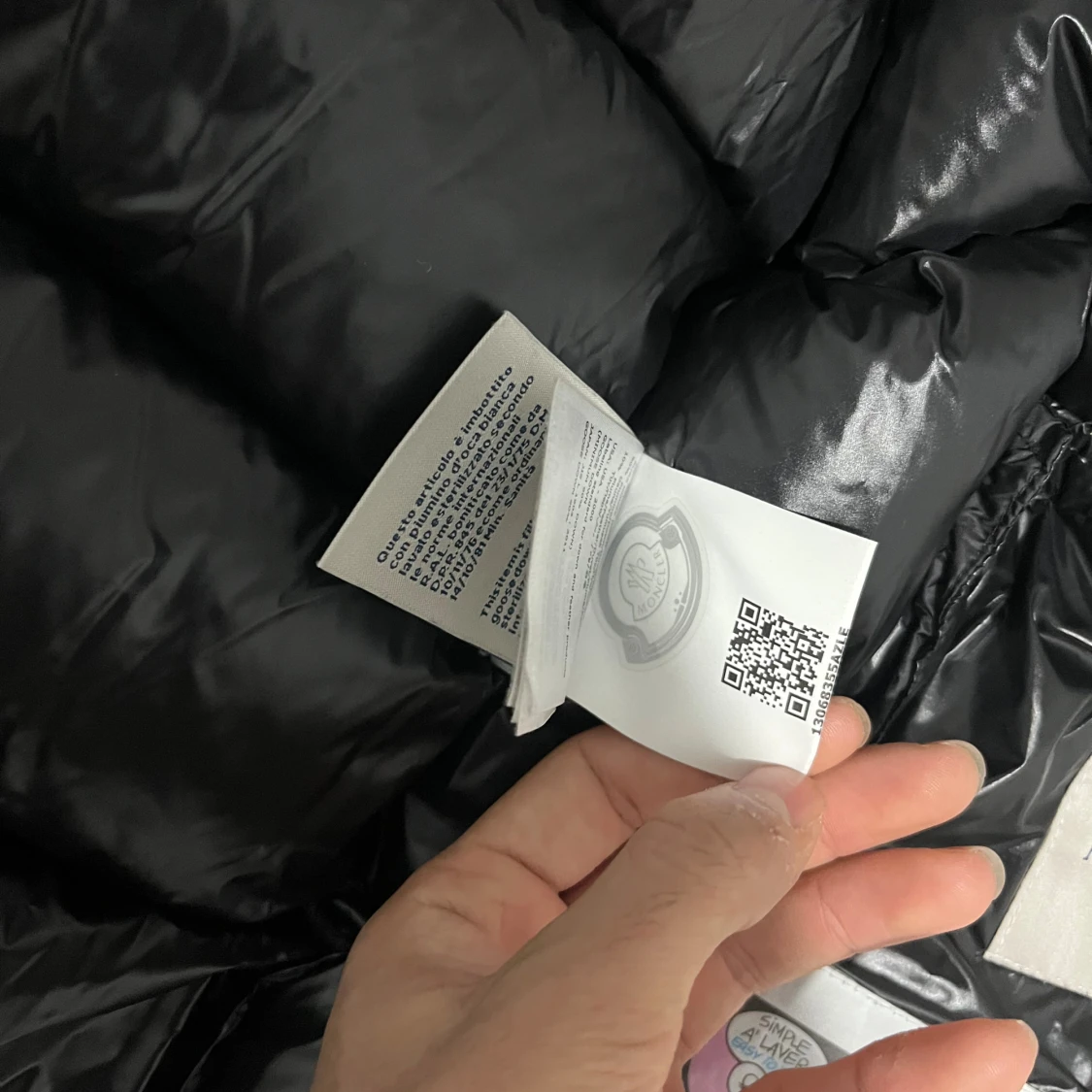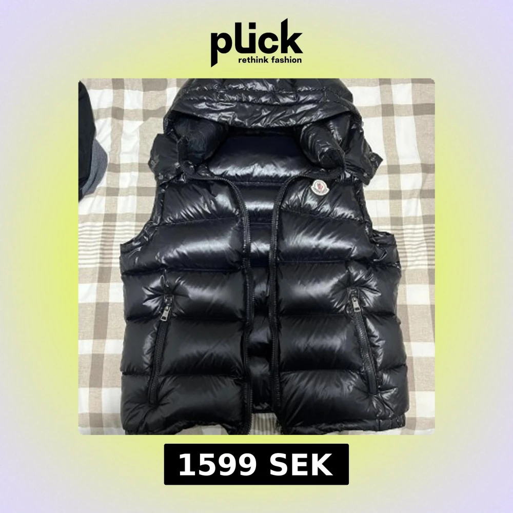 Snygg svart dunväst från Moncler Storlek S med glansig finish, hög krage och två dragkedjefickor framtill. Västen har klassisk Moncler-logga på bröstet och coolt serietidningstryck på insidan. Perfekt för lager-på-lager och streetstyle.