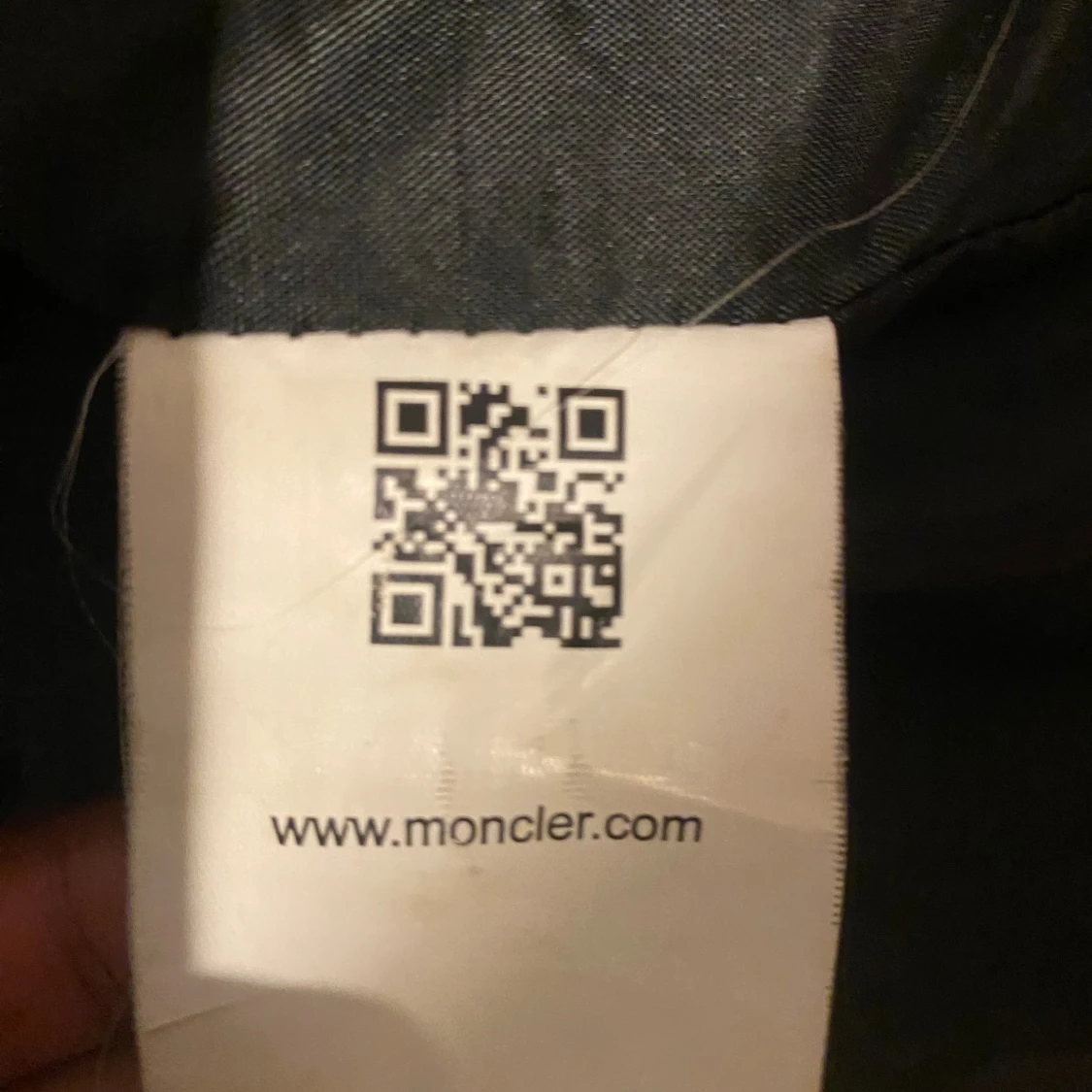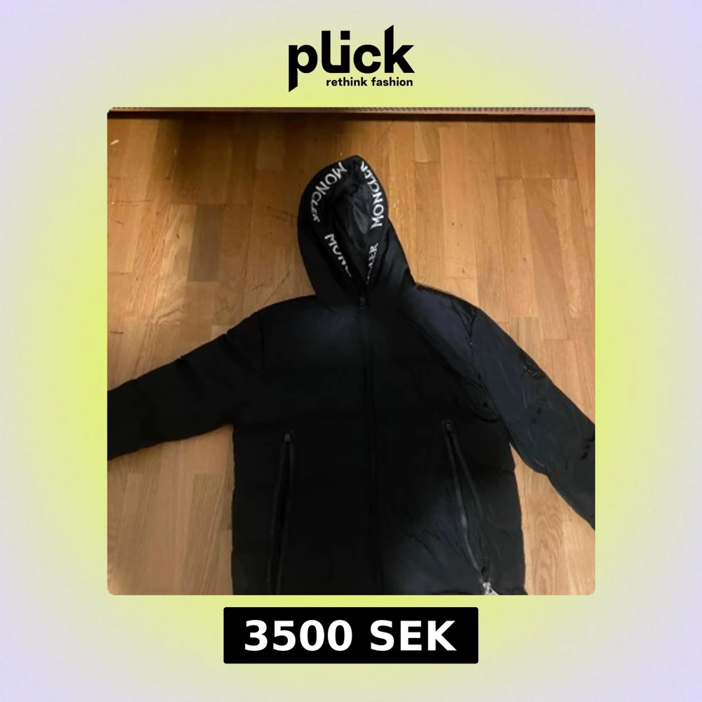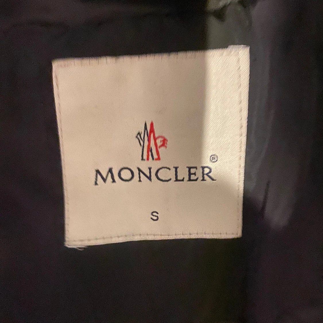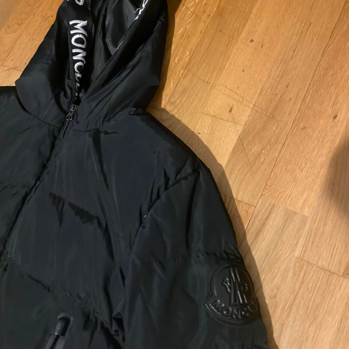 Svart dunjacka från Moncler med huva och tydlig logga på ärmen. Jackan har dragkedja framtill, två fickor med dragkedja och Moncler-tryck på insidan av huvan. Perfekt för kalla dagar och riktigt snygg streetstil.