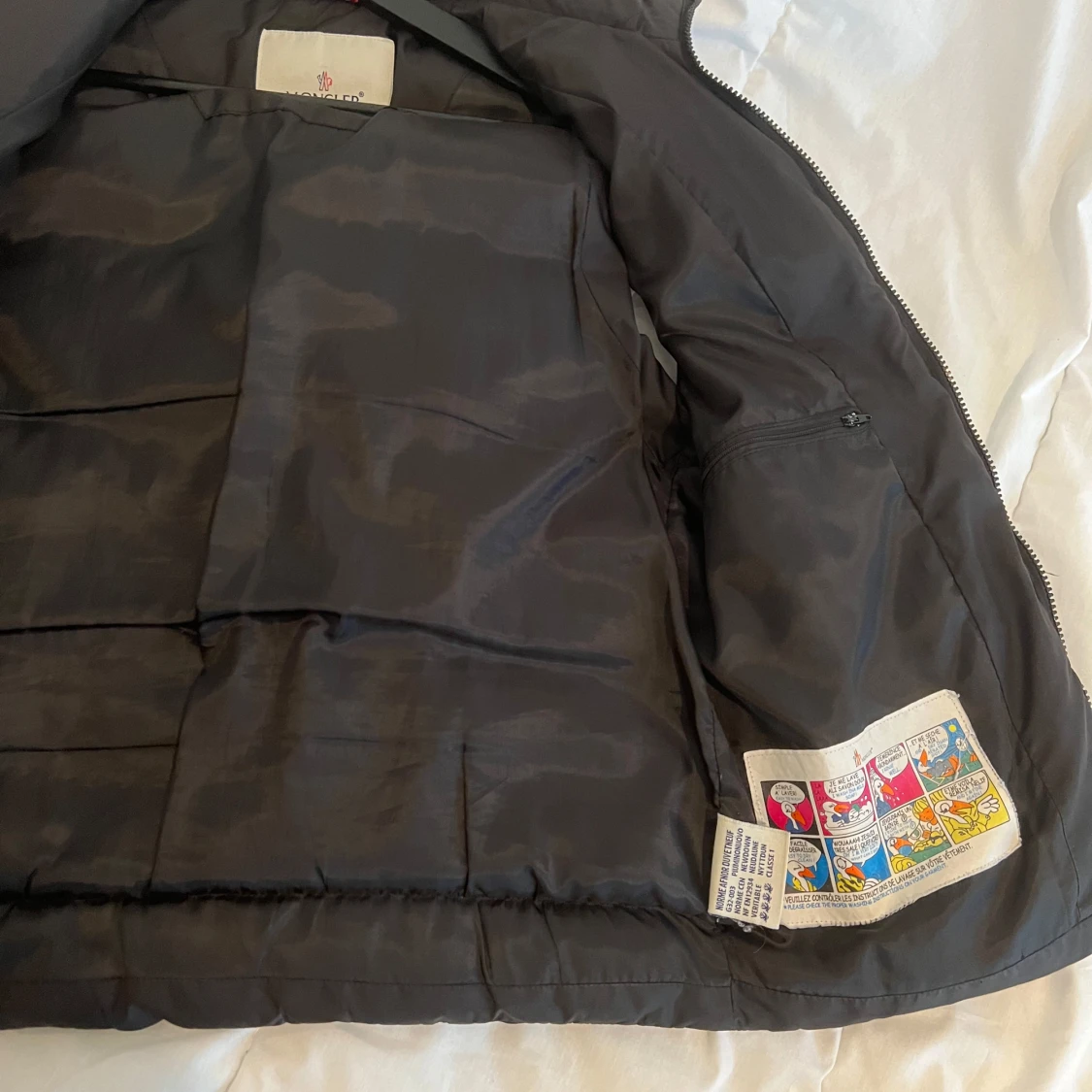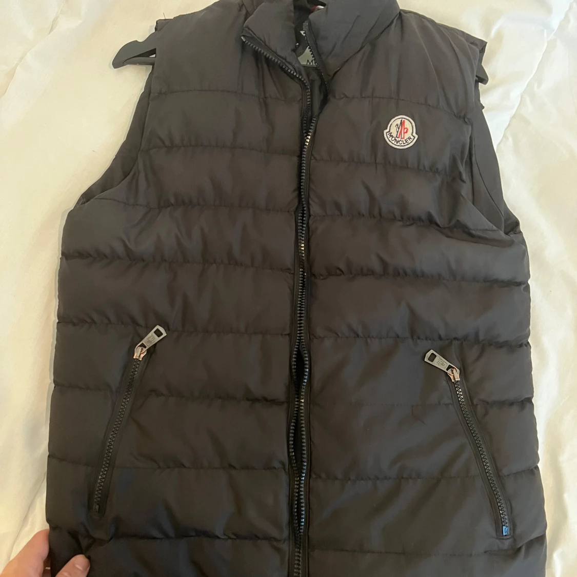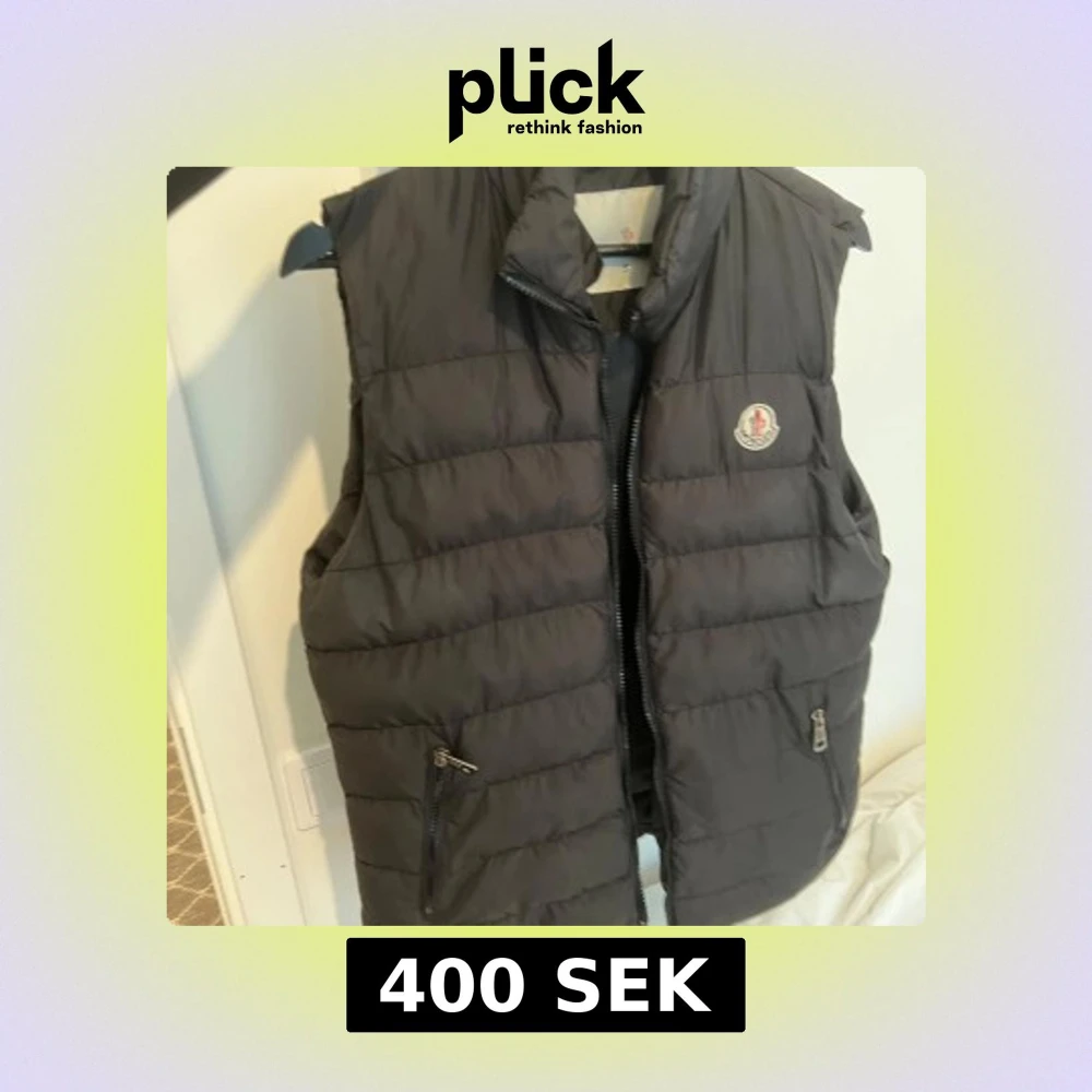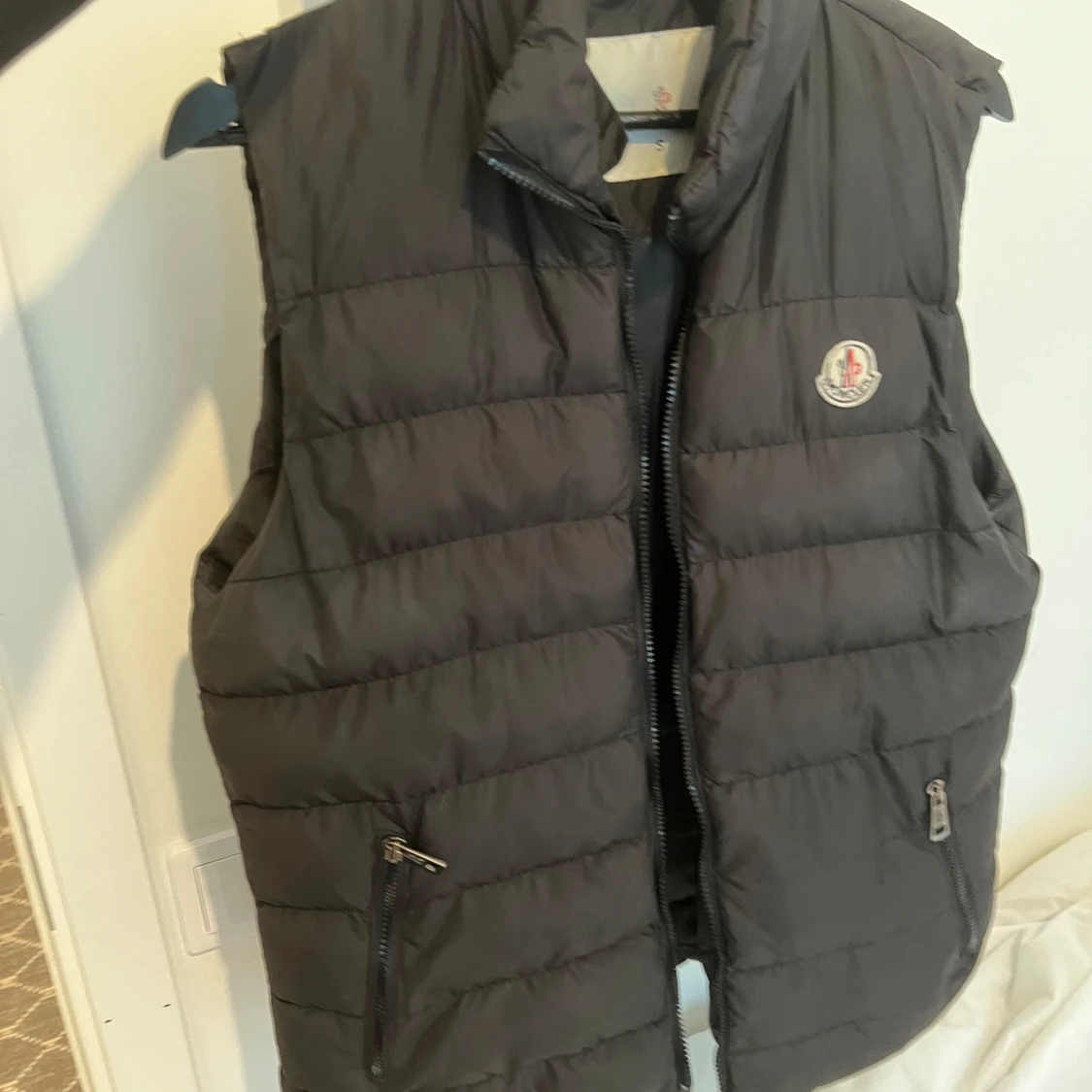 Snygg svart dunväst från Moncler med klassisk logga på bröstet. Västen har quiltad design, hög krage och två fickor med dragkedja framtill. Perfekt att slänga över en hoodie eller tröja för extra värme. Stängs med dragkedja hela vägen upp.