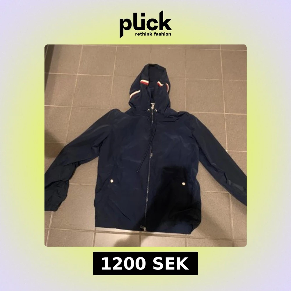 Snygg mörkblå vindjacka från Moncler med huva och vita/röda detaljer. Jackan har dragkedja framtill, två fickor med tryckknappar och Moncler-logga på bröstet. Perfekt för blåsiga dagar och enkel att matcha med det mesta.