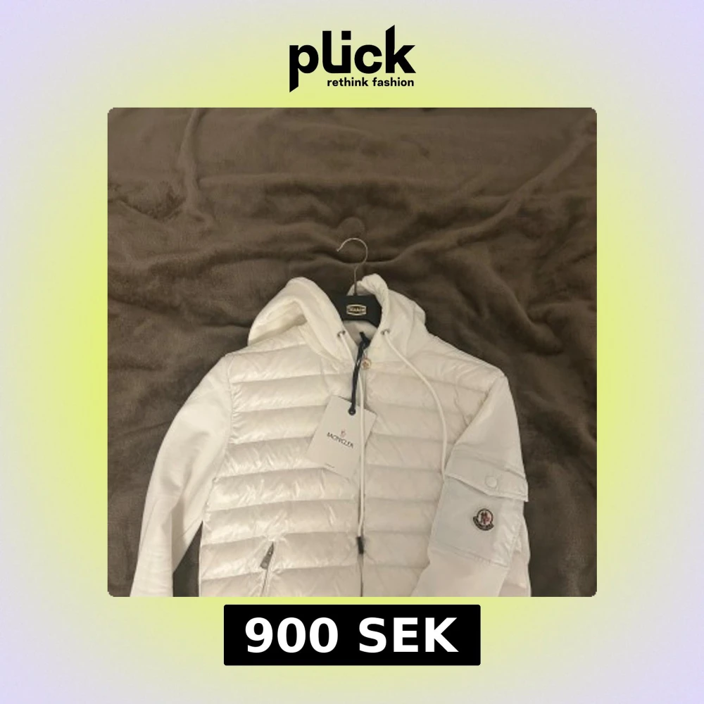 Säljer en snygg vit pufferjacka från Moncler med huva och snörning. Jackan har quiltad framsida, dragkedja och en ikonisk Moncler-logga på ärmen med ficka. Materialmix av polyester och bomull ger en skön känsla. Perfekt för dig som vill ha en clean och stilren look. Har en pytte liten svart fläck på ryggen men syns knappt och loggan kan skannas med mobil