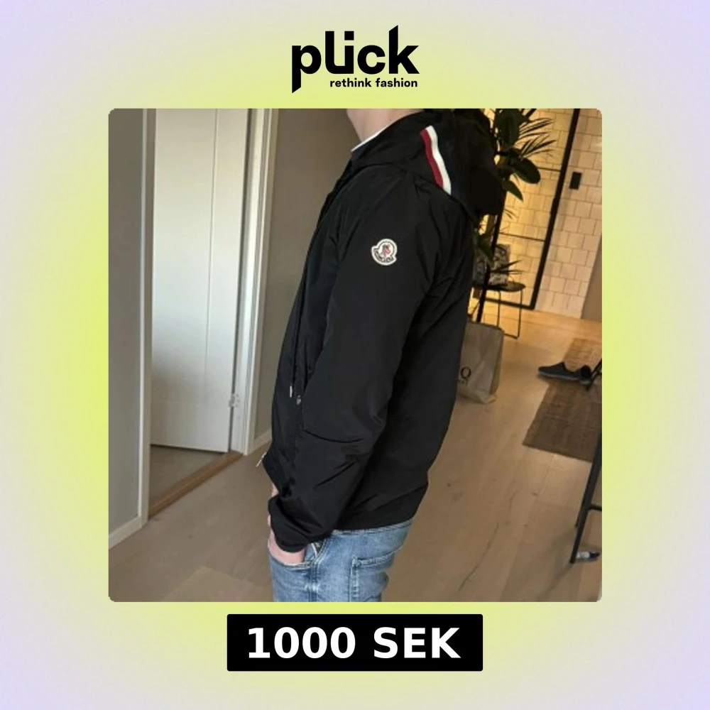 Säljer en snygg svart jacka från Moncler med huva och dragkedja. Jackan har Moncler-logga på ärmen och ränder i rött, vitt och blått på huvan. Perfekt för en stilren look. (Från pandabuy)