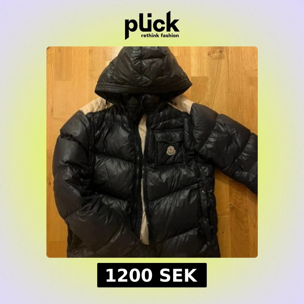 Säljer nu min älskade jacka. Snygg svart dunjacka från Moncler med beige detaljer på axlarna och huva. Jackan har quiltad design, dragkedja framtill och en bröstficka med Moncler-logga. Perfekt för kalla dagar när du vill hålla stilen. Priset pga vissa slitningar. S men suttit som M