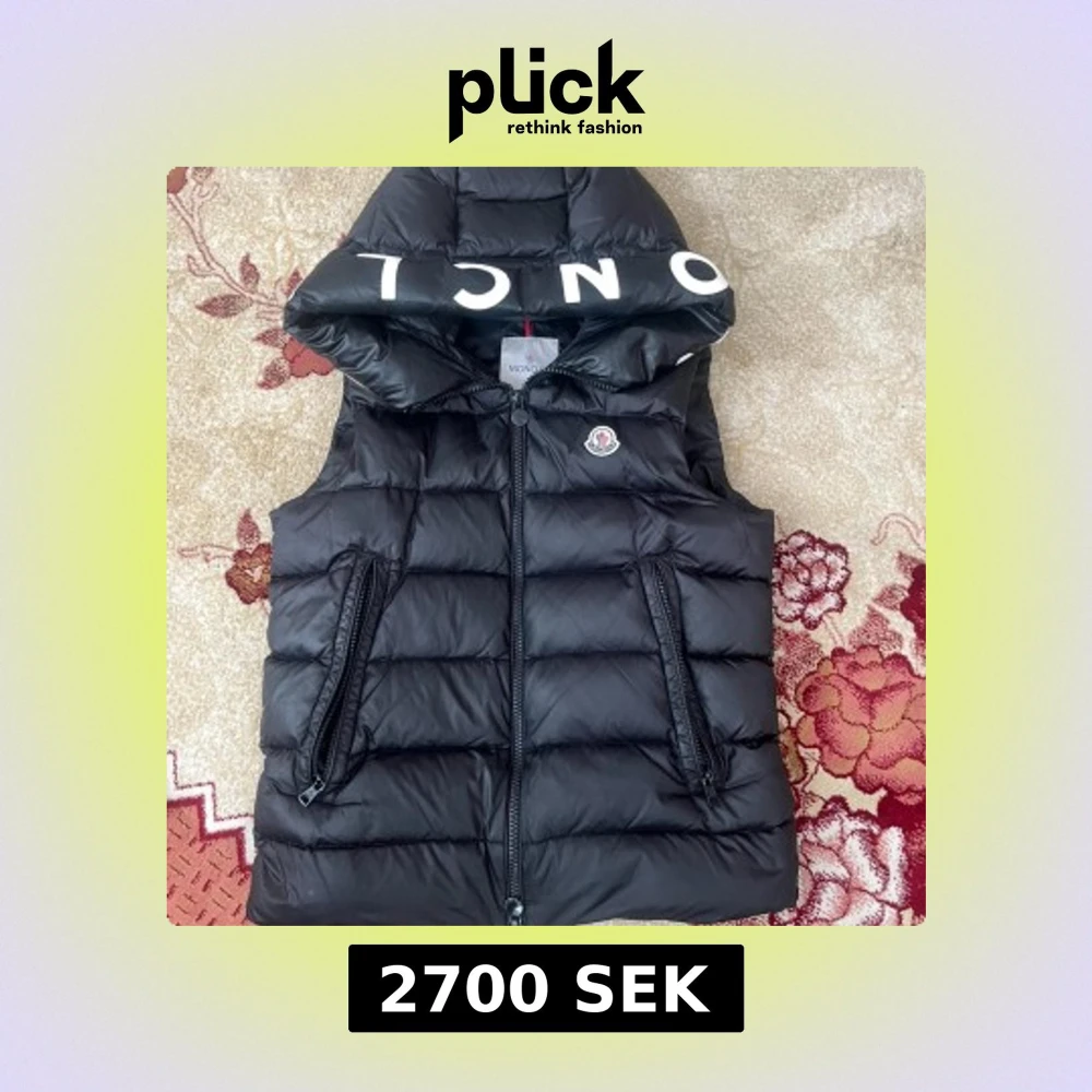 Snygg svart dunväst från Moncler med stor huva och vit logotyptext på kanten. Västen har två dragkedjefickor och klassisk Moncler-logga på bröstet. Perfekt för lager-på-lager och streetstyle. Storlek S