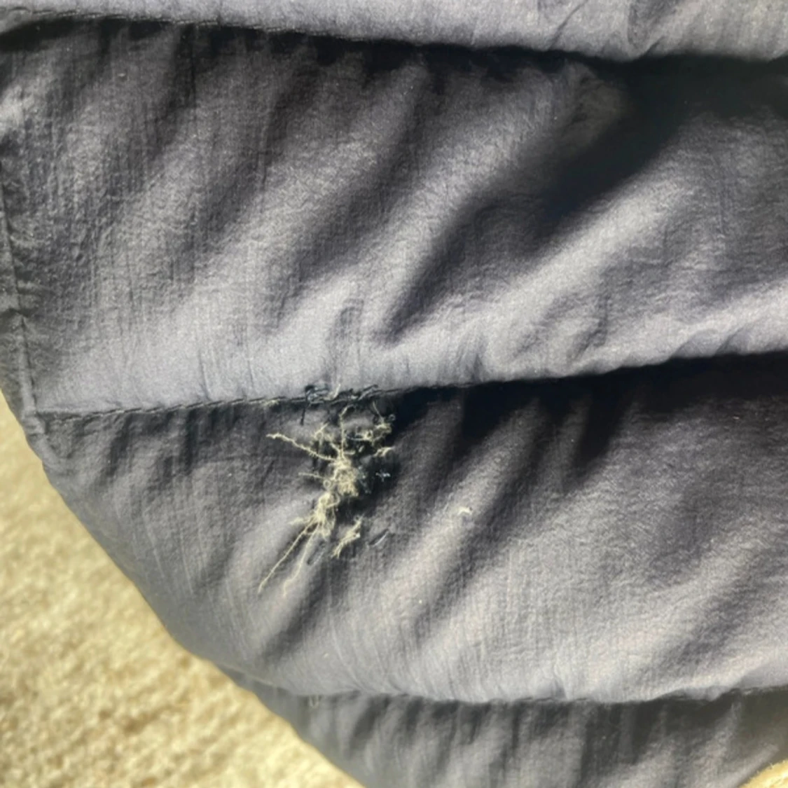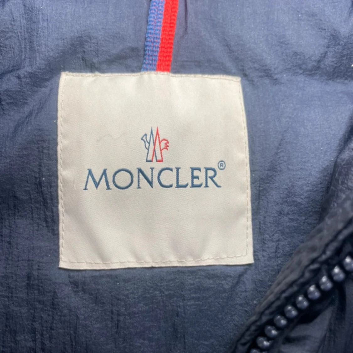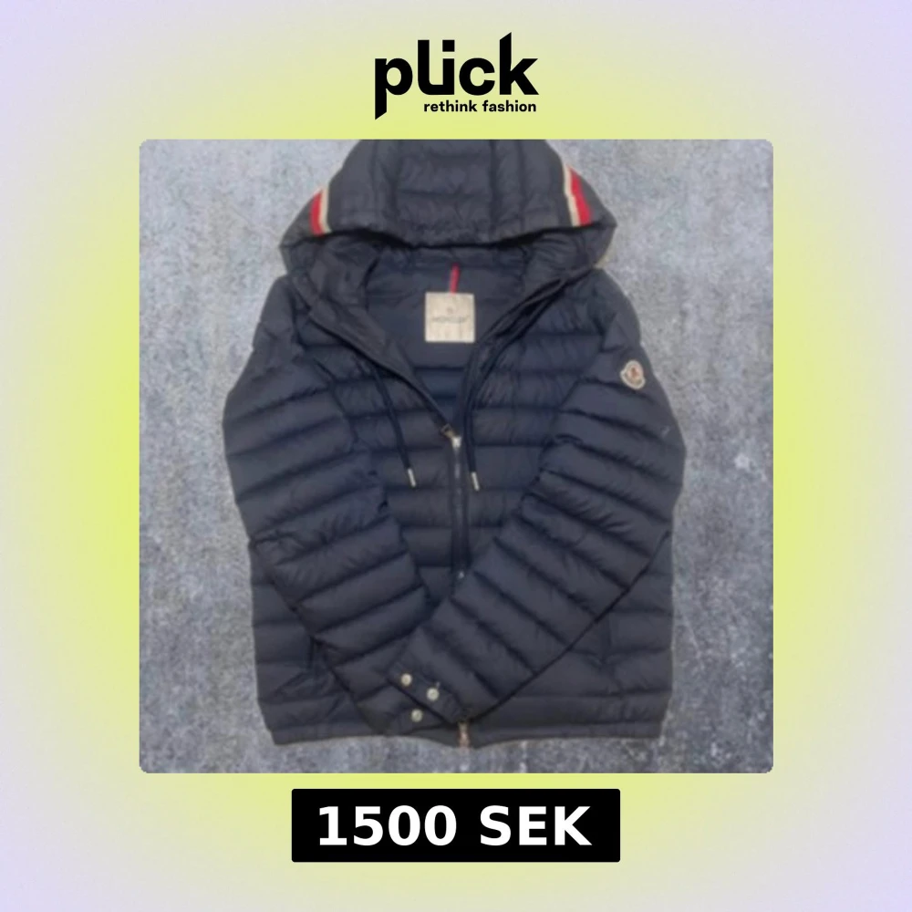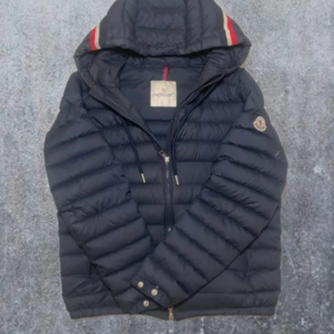 Svart dunjacka från Moncler med huva och coola röda och vita detaljer på luvan. Jackan har dragkedja framtill, två fickor och klassisk Moncler-logga på ärmen. Puffig design som håller värmen och ger en snygg siluett. Perfekt för kalla dagar.