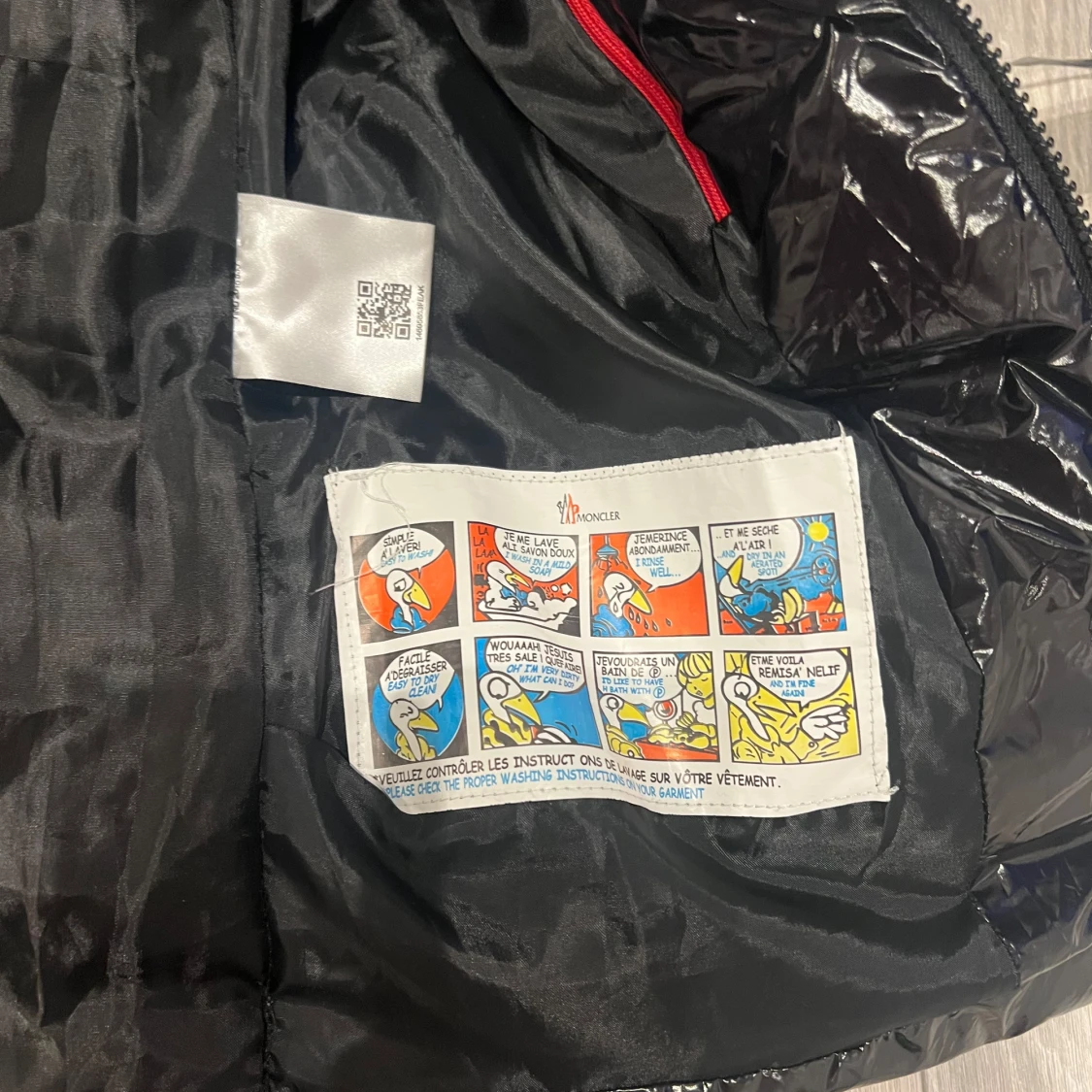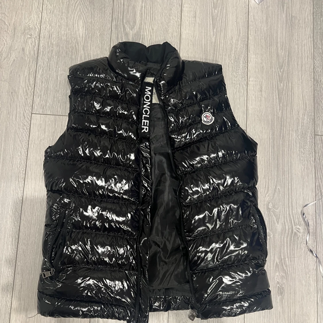 Snygg svart dunväst från Moncler med glansig finish och hög krage. Västen har dragkedja framtill, två fickor med dragkedja och klassisk Moncler-logga på bröstet. Perfekt för lager-på-lager och streetstyle.