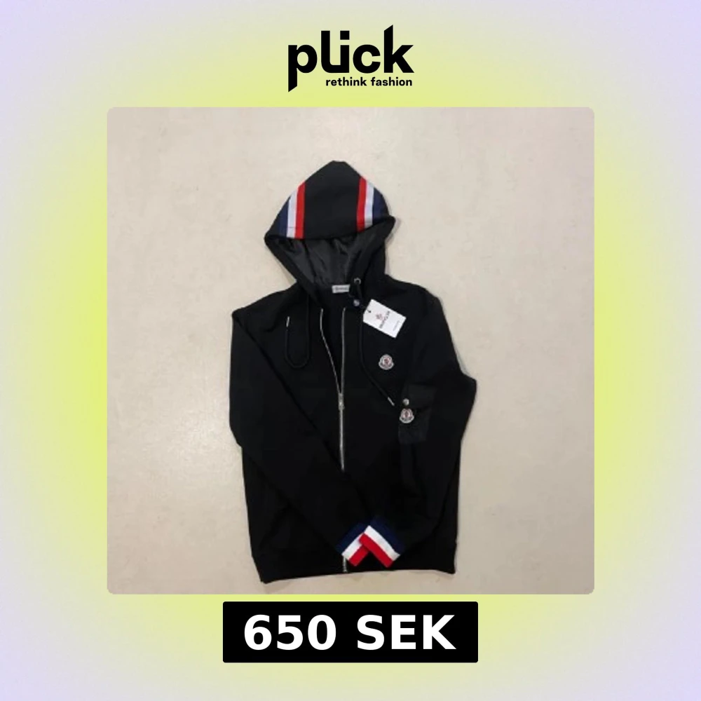 Svart hoodiejacka från Moncler med dragkedja framtill, huva och ribbade muddar i rött, vitt och blått. Jackan har Moncler-logga på bröstet och ärmen samt snörning i huvan. Perfekt för en sportig och stilren look.