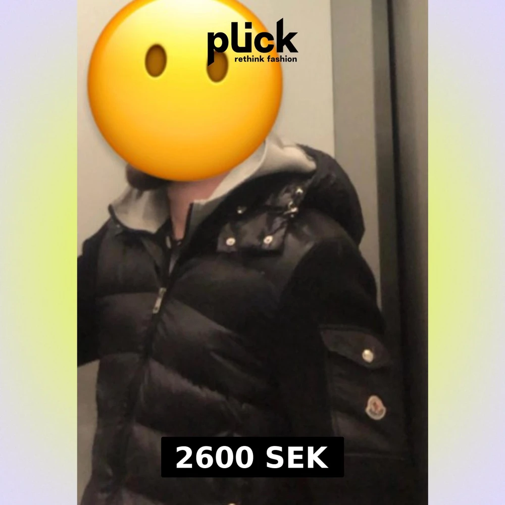 Säljer en svart dunjacka från Moncler med klassisk quiltad design och dragkedja framtill. Jackan har huva, fickor med tryckknappar och Moncler-logga på ärmen. Perfekt för kalla dagar och riktigt snygg streetstil.