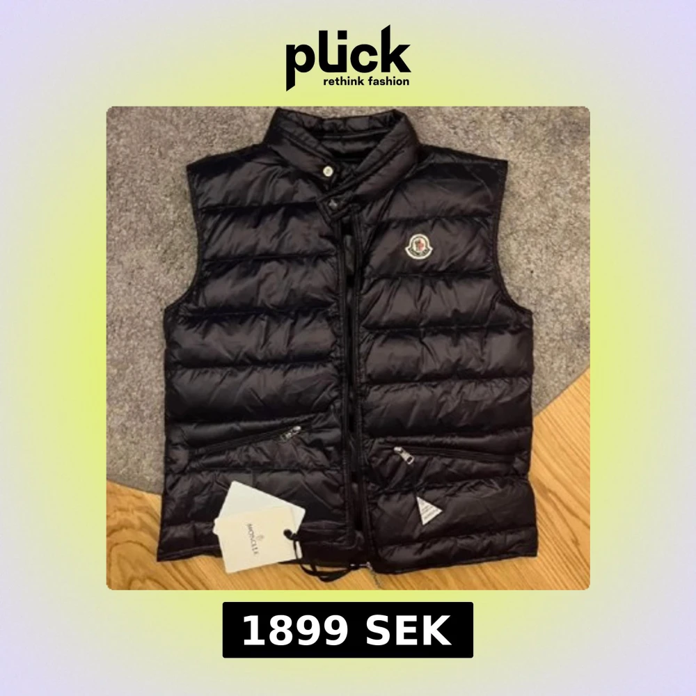 Säljer en svart, glansig dunväst från Moncler med ståkrage och dragkedja framtill. Västen har två snedställda fickor med dragkedja och Moncler-logga på bröstet. Perfekt för lager-på-lager och stilren look.