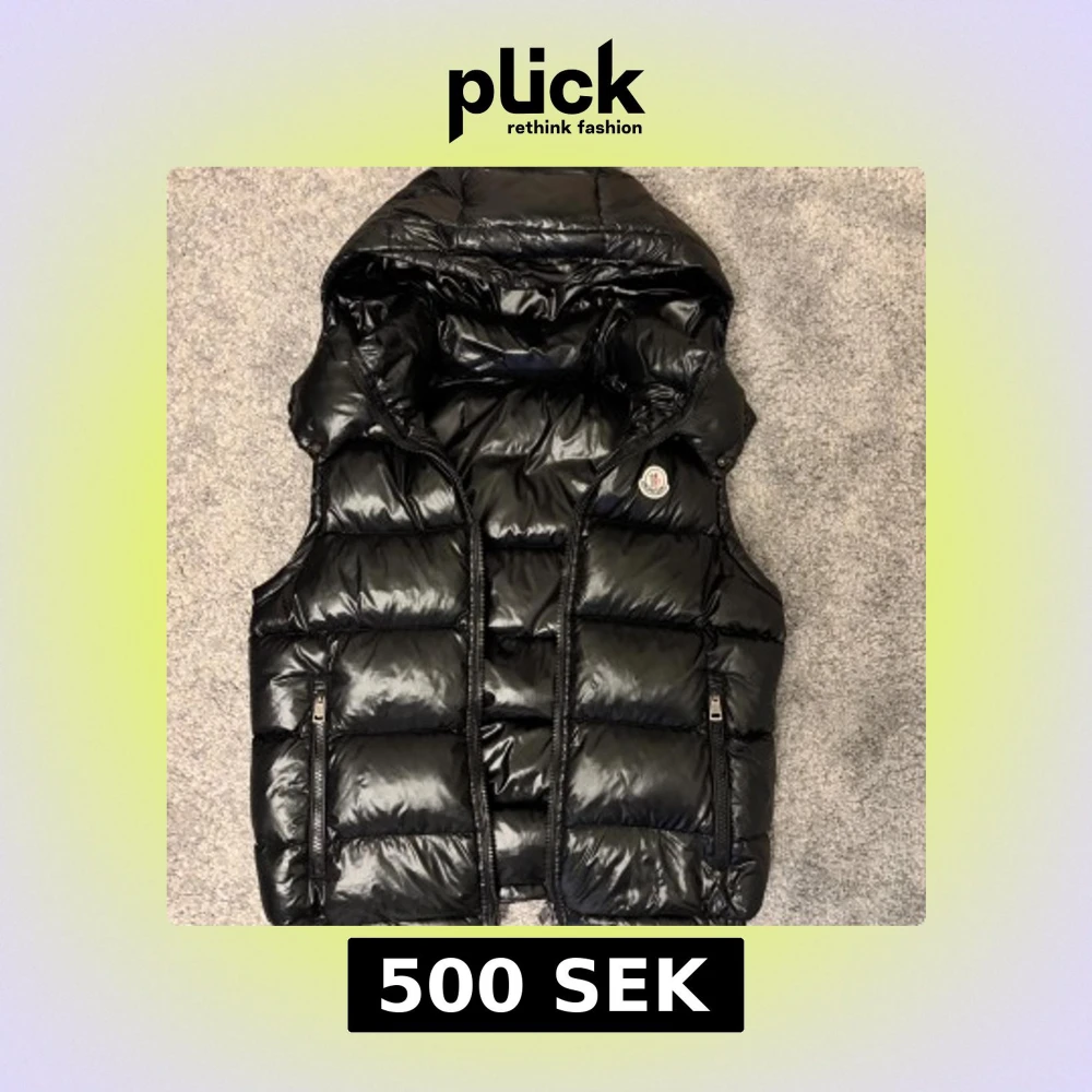 Snygg svart dunväst från Moncler med glansig finish och huva. Västen har två dragkedjefickor framtill och Moncler-logga på bröstet. Perfekt för lager-på-lager och håller dig varm under kyliga dagar. Stängs med dragkedja framtill.