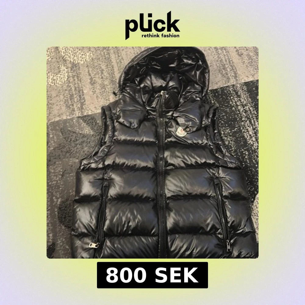 Snygg svart dunväst från Moncler med glansig finish och huva. Västen har dragkedja framtill och två fickor med dragkedja. Klassisk Moncler-logga på bröstet och serietidningsdetalj på insidan.